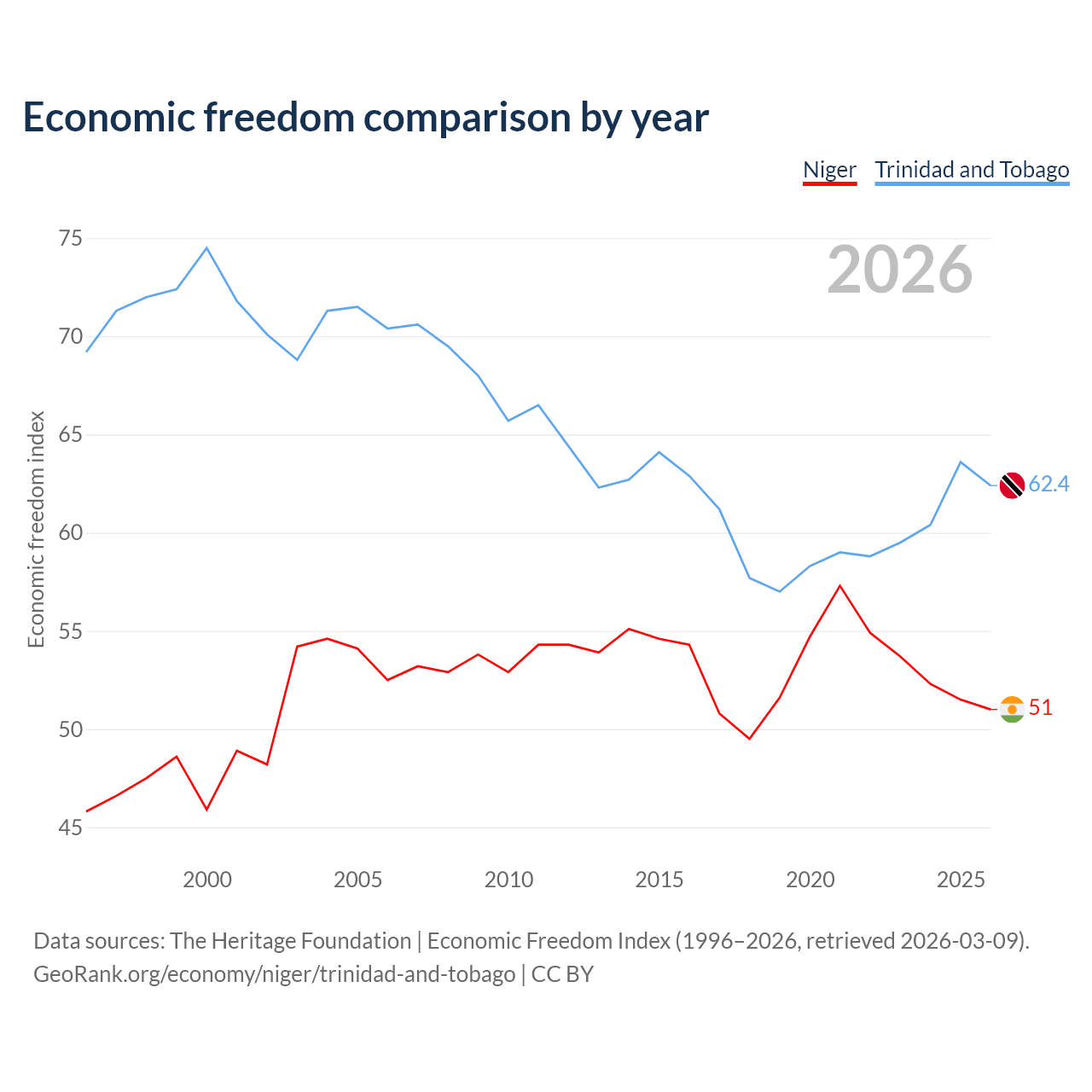 The Economic Freedom Index for Niger is 51, ranking 156/197, compared to 62.4 for Trinidad and Tobago, ranking 87/197. The chart above displays a comparison of annual changes in economic freedom indexes.