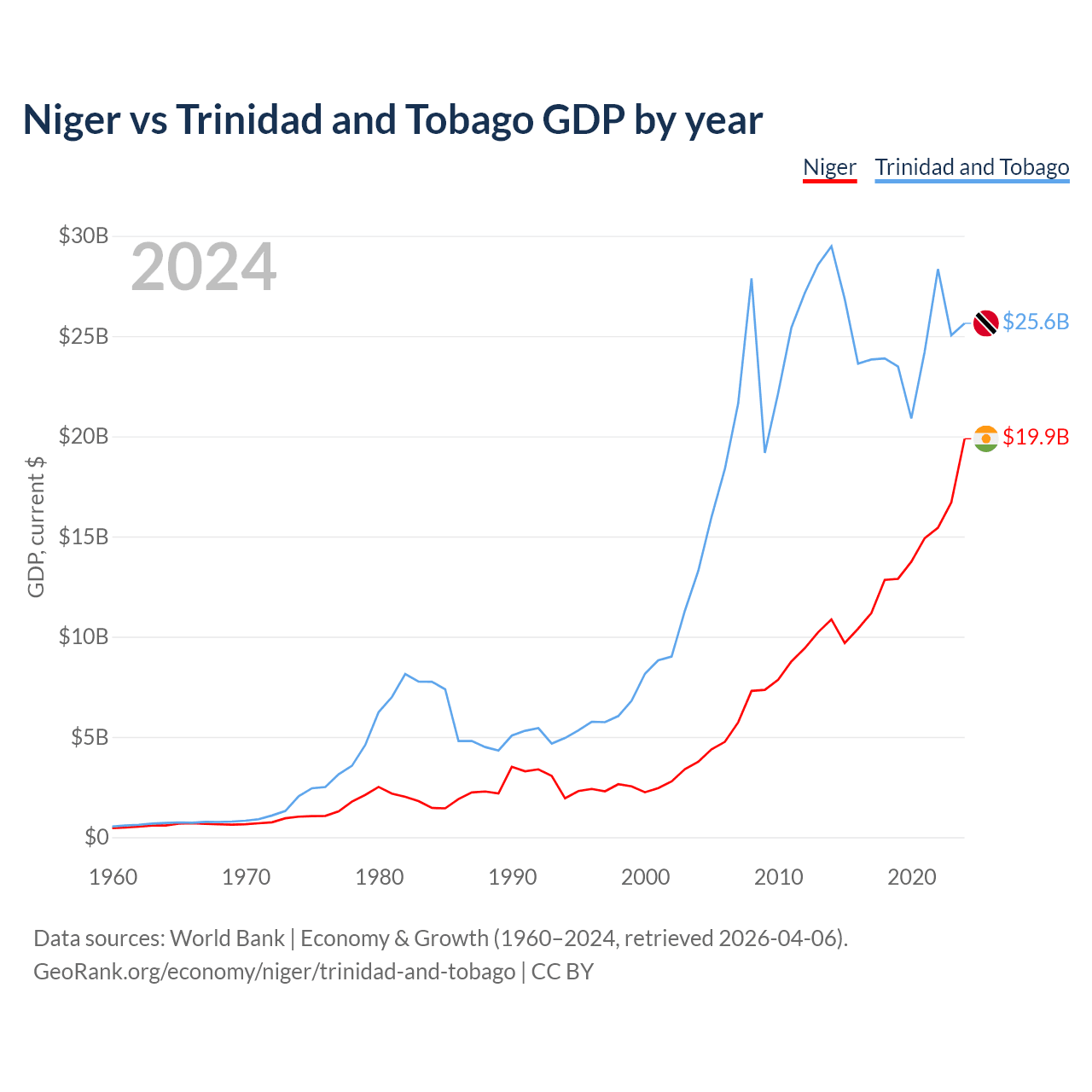 Niger has a GDP of $19.9B compared to $25.6B for Trinidad and Tobago, ranking 130/197 and 115/197 by economy size, respectively.