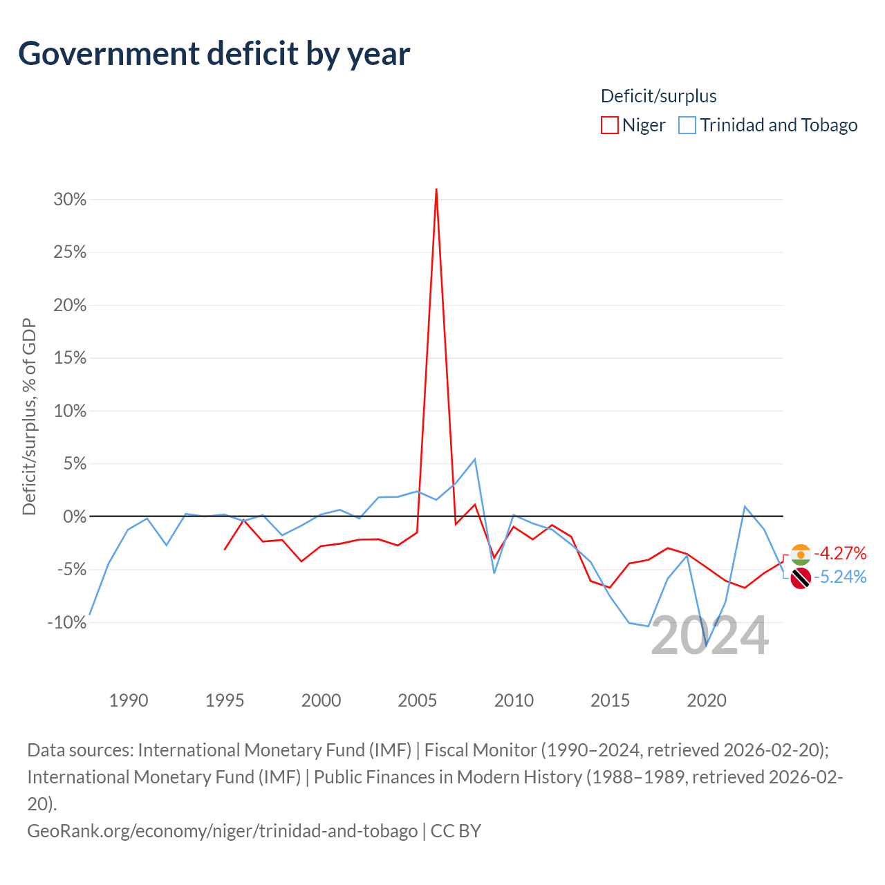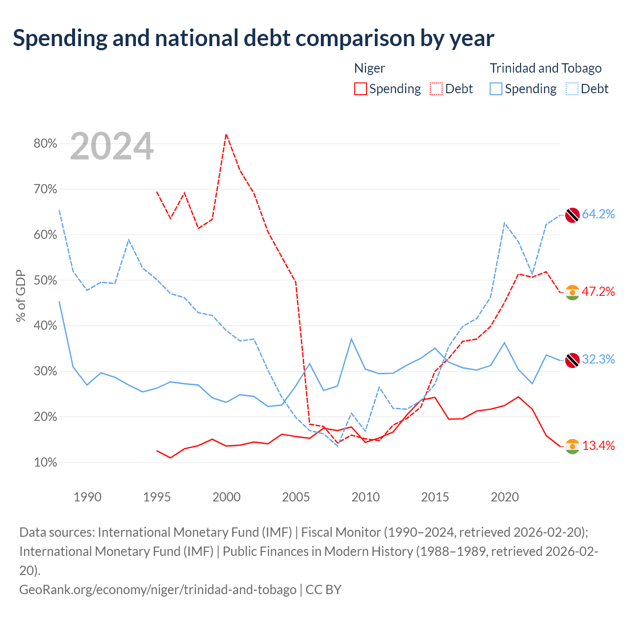 Niger has $9.39B in government debt (47.2% of GDP), compared to $16.5B (64.2% of GDP) in Trinidad and Tobago.