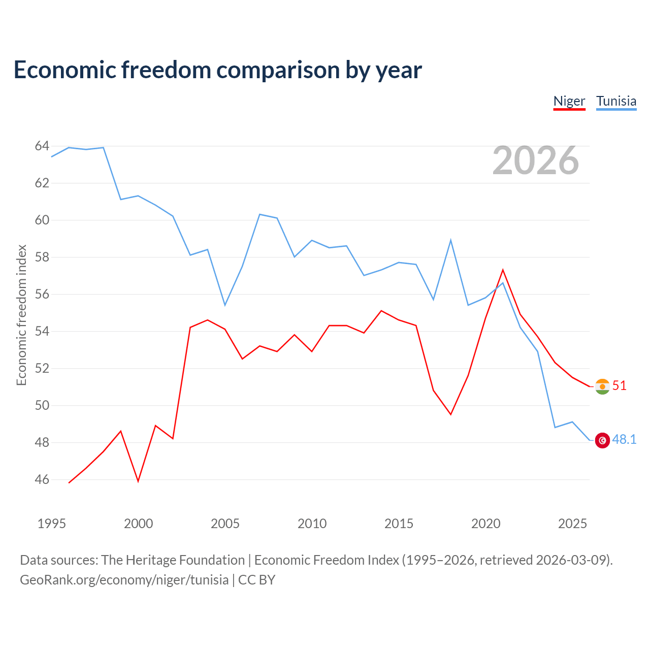The Economic Freedom Index for Niger is 51, ranking 156/197, compared to 48.1 for Tunisia, ranking 172/197. The chart above displays a comparison of annual changes in economic freedom indexes.