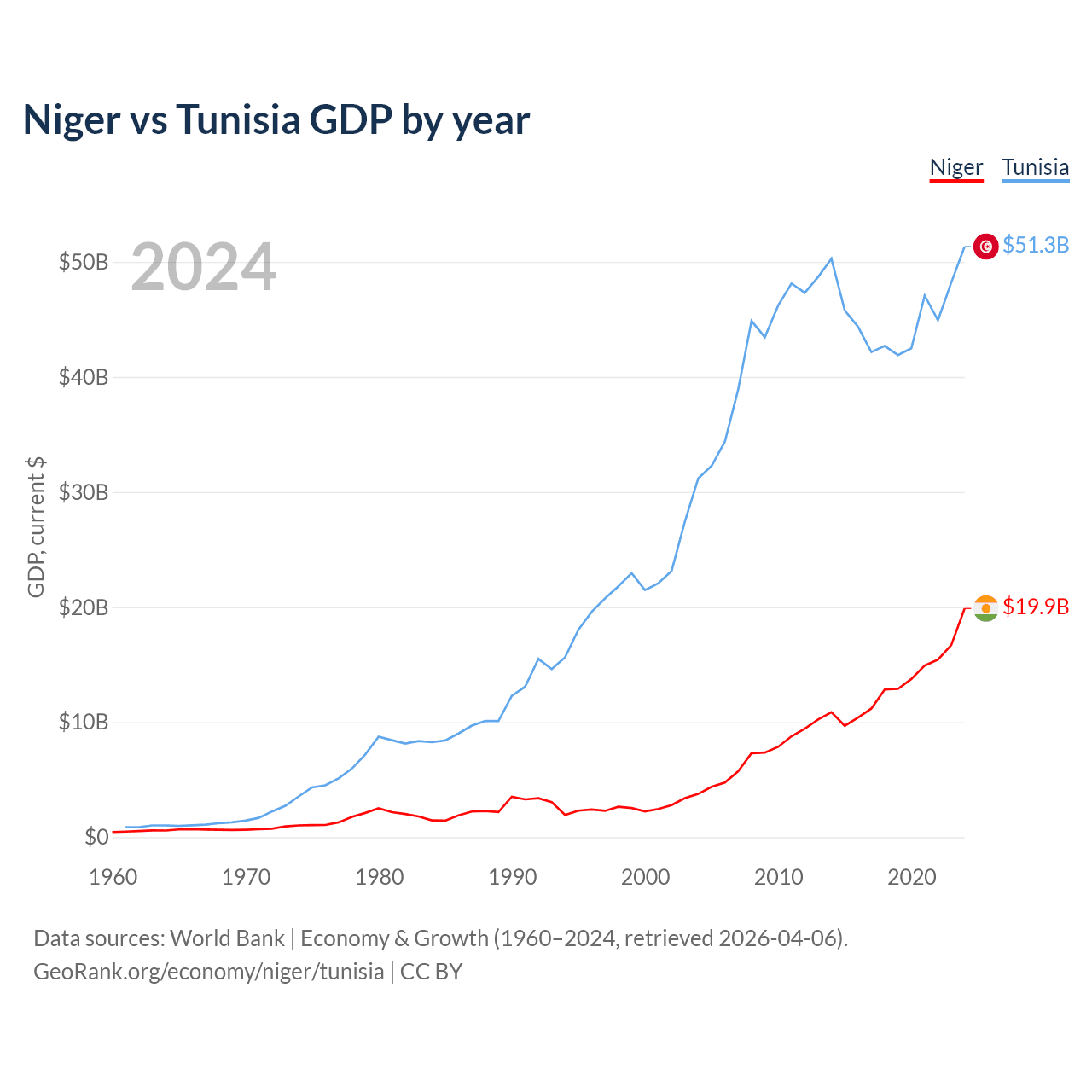 Niger has a GDP of $19.9B compared to $51.3B for Tunisia, ranking 130/197 and 93/197 by economy size, respectively.