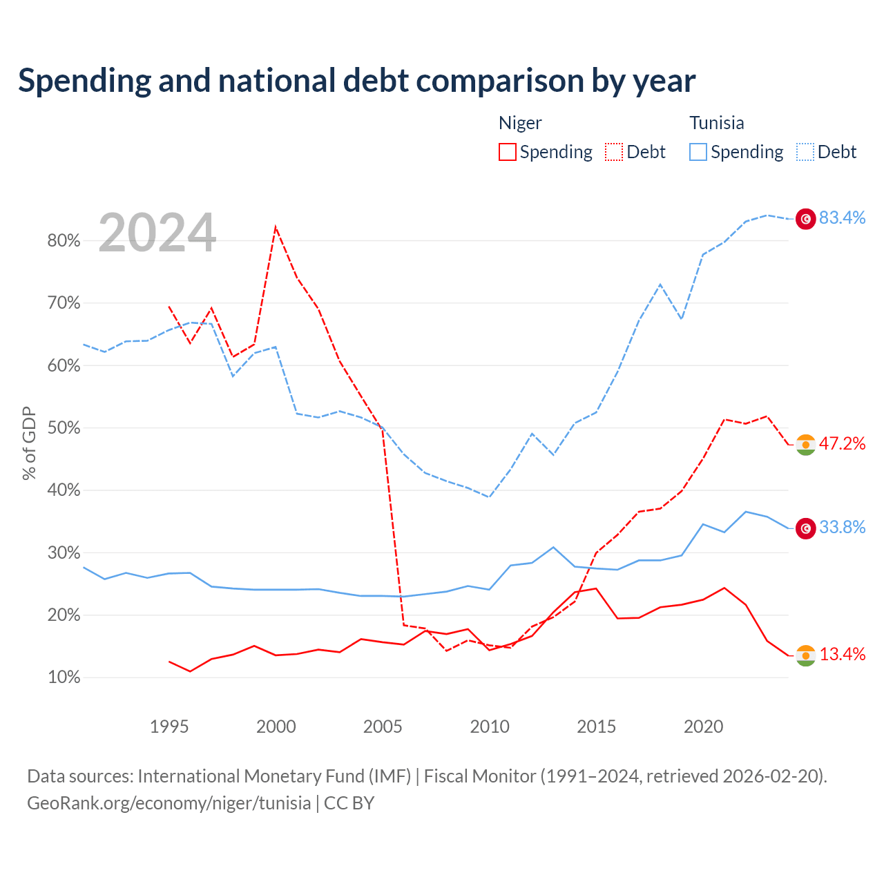 Niger has $9.39B in government debt (47.2% of GDP), compared to $42.8B (83.4% of GDP) in Tunisia.