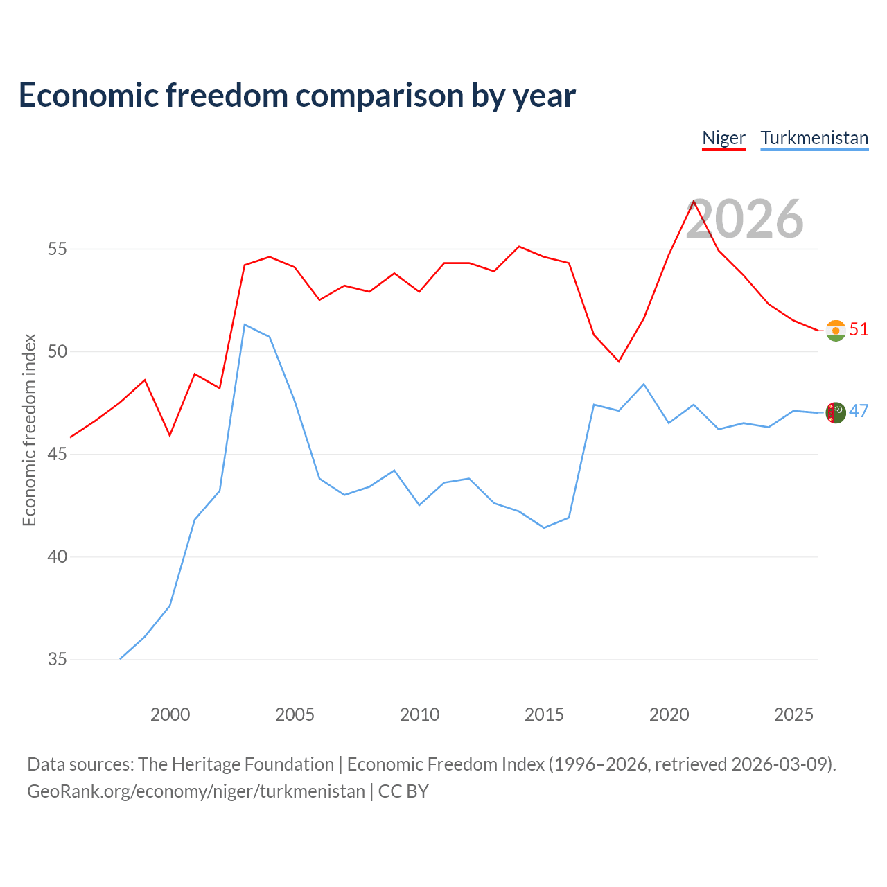 The Economic Freedom Index for Niger is 51, ranking 156/197, compared to 47 for Turkmenistan, ranking 177/197. The chart above displays a comparison of annual changes in economic freedom indexes.