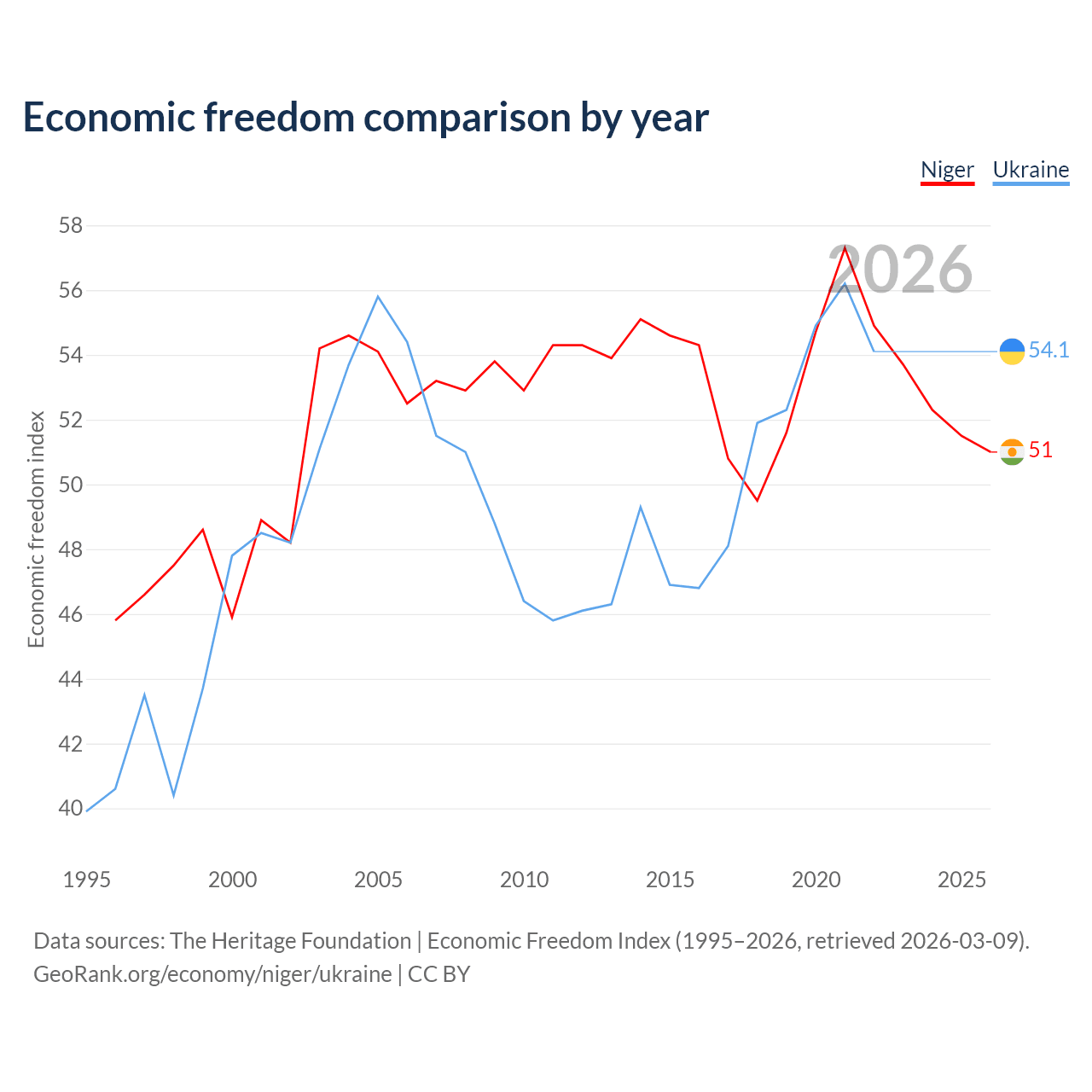 The Economic Freedom Index for Niger is 51, ranking 156/197, compared to 54.1 for Ukraine, ranking 135/197. The chart above displays a comparison of annual changes in economic freedom indexes.