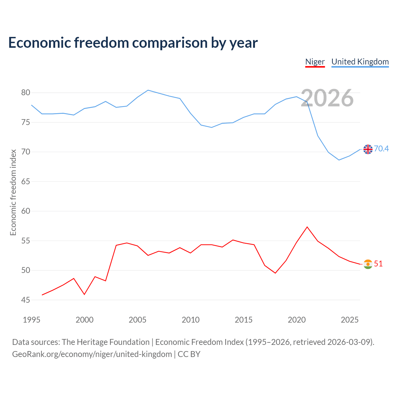 The Economic Freedom Index for Niger is 51, ranking 156/197, compared to 70.4 for the United Kingdom, ranking 35/197. The chart above displays a comparison of annual changes in economic freedom indexes.