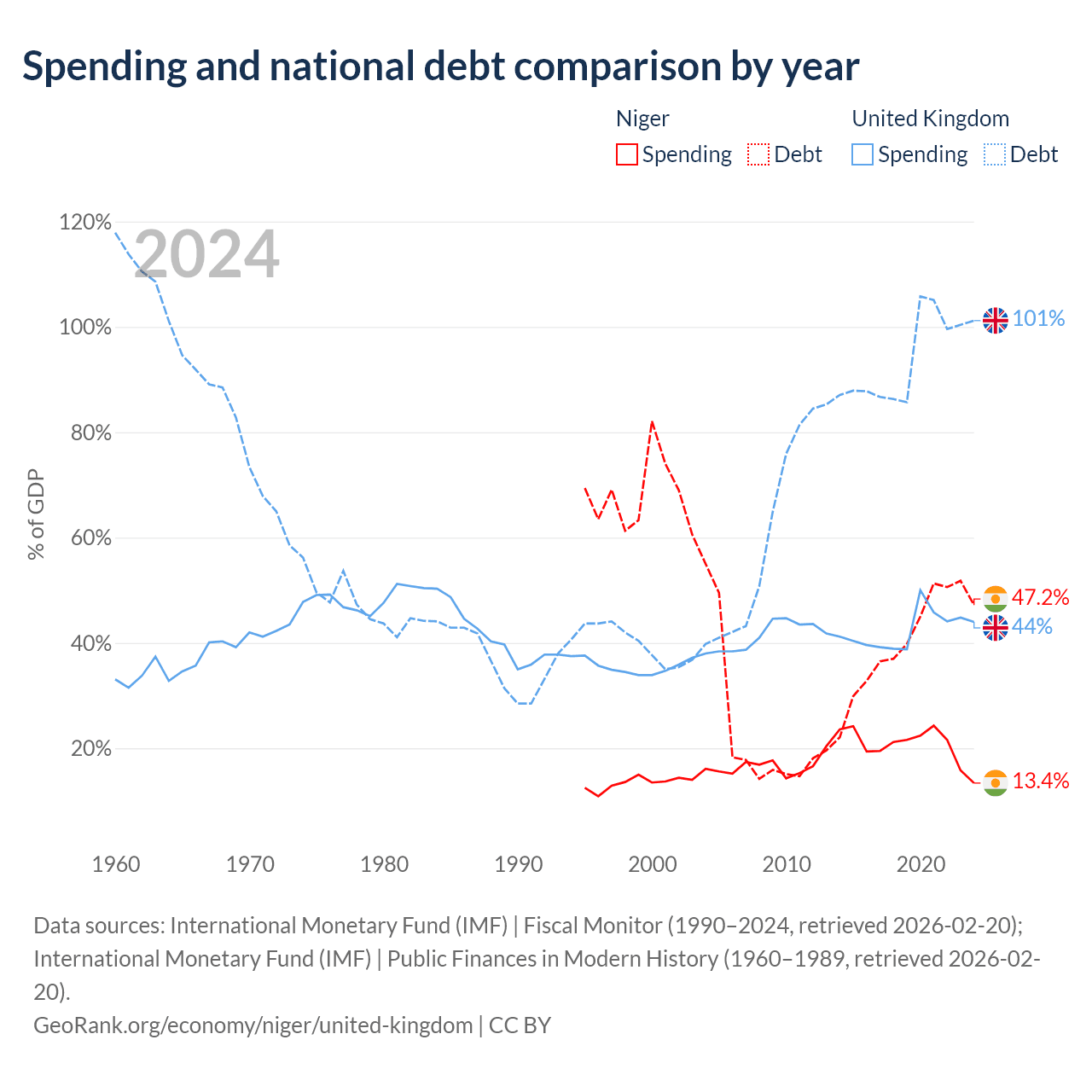 Niger has $9.39B in government debt (47.2% of GDP), compared to $3.73T (101.2% of GDP) in the United Kingdom.