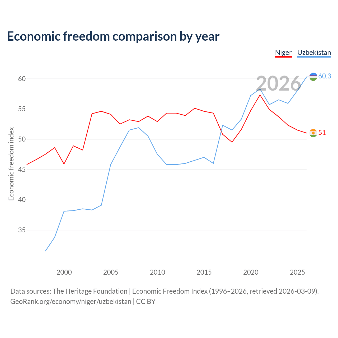 The Economic Freedom Index for Niger is 51, ranking 156/197, compared to 60.3 for Uzbekistan, ranking 94/197. The chart above displays a comparison of annual changes in economic freedom indexes.