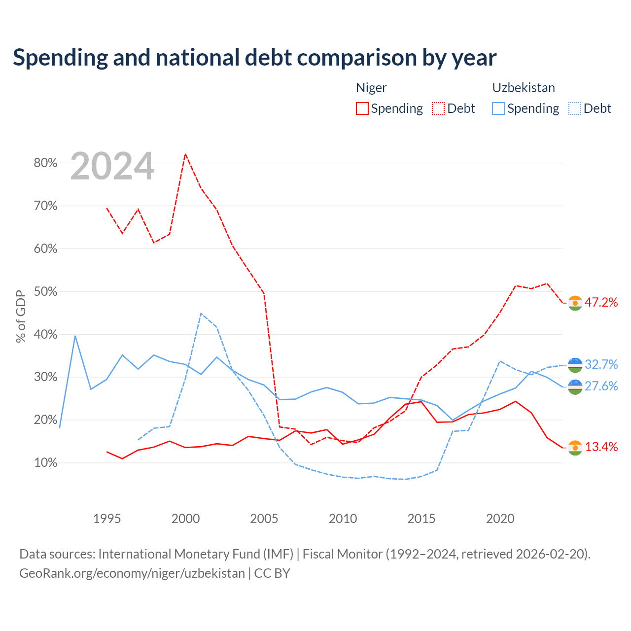Niger has $9.39B in government debt (47.2% of GDP), compared to $37.5B (32.7% of GDP) in Uzbekistan.
