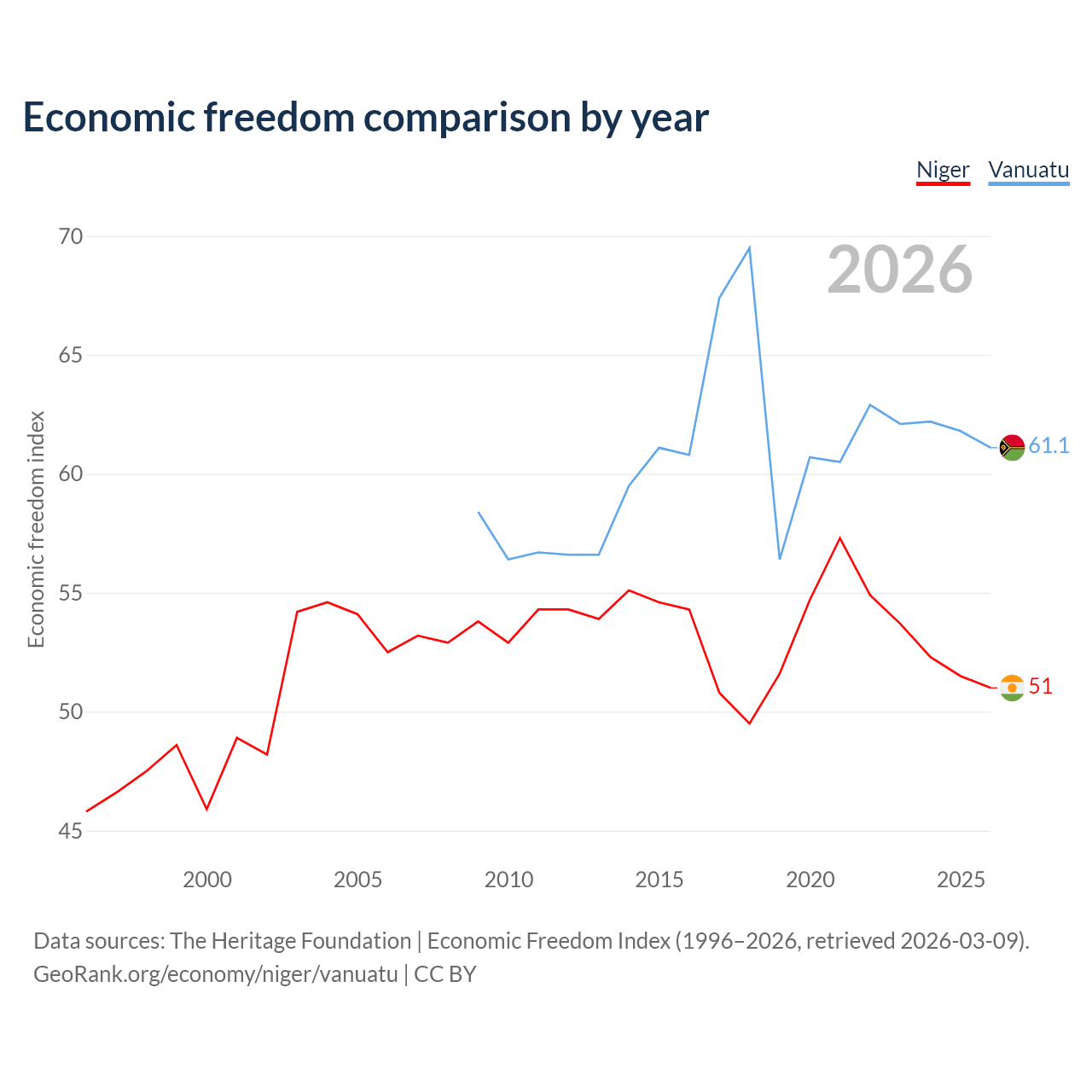 The Economic Freedom Index for Niger is 51, ranking 156/197, compared to 61.1 for Vanuatu, ranking 92/197. The chart above displays a comparison of annual changes in economic freedom indexes.