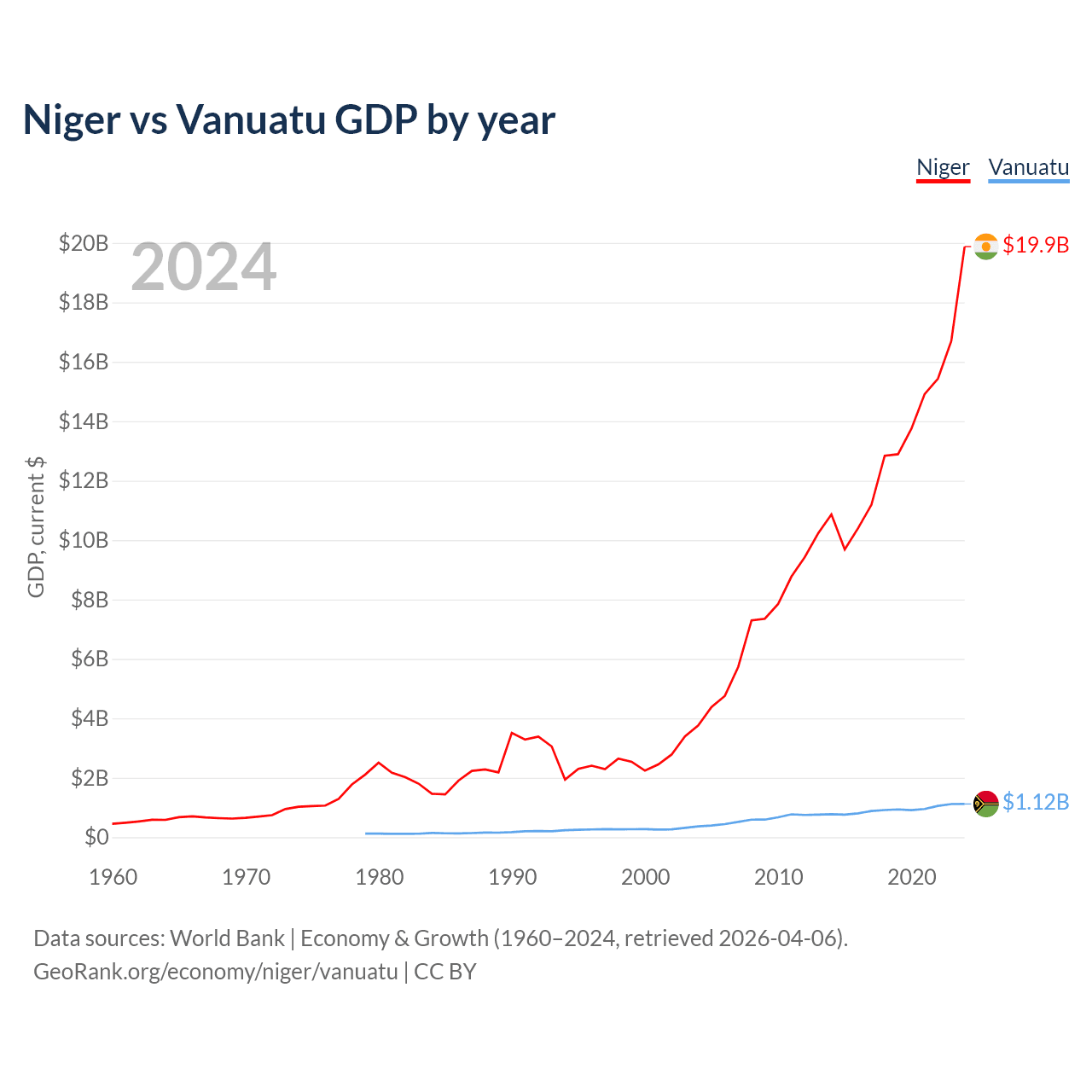 Niger has a GDP of $19.9B compared to $1.12B for Vanuatu, ranking 130/197 and 188/197 by economy size, respectively.