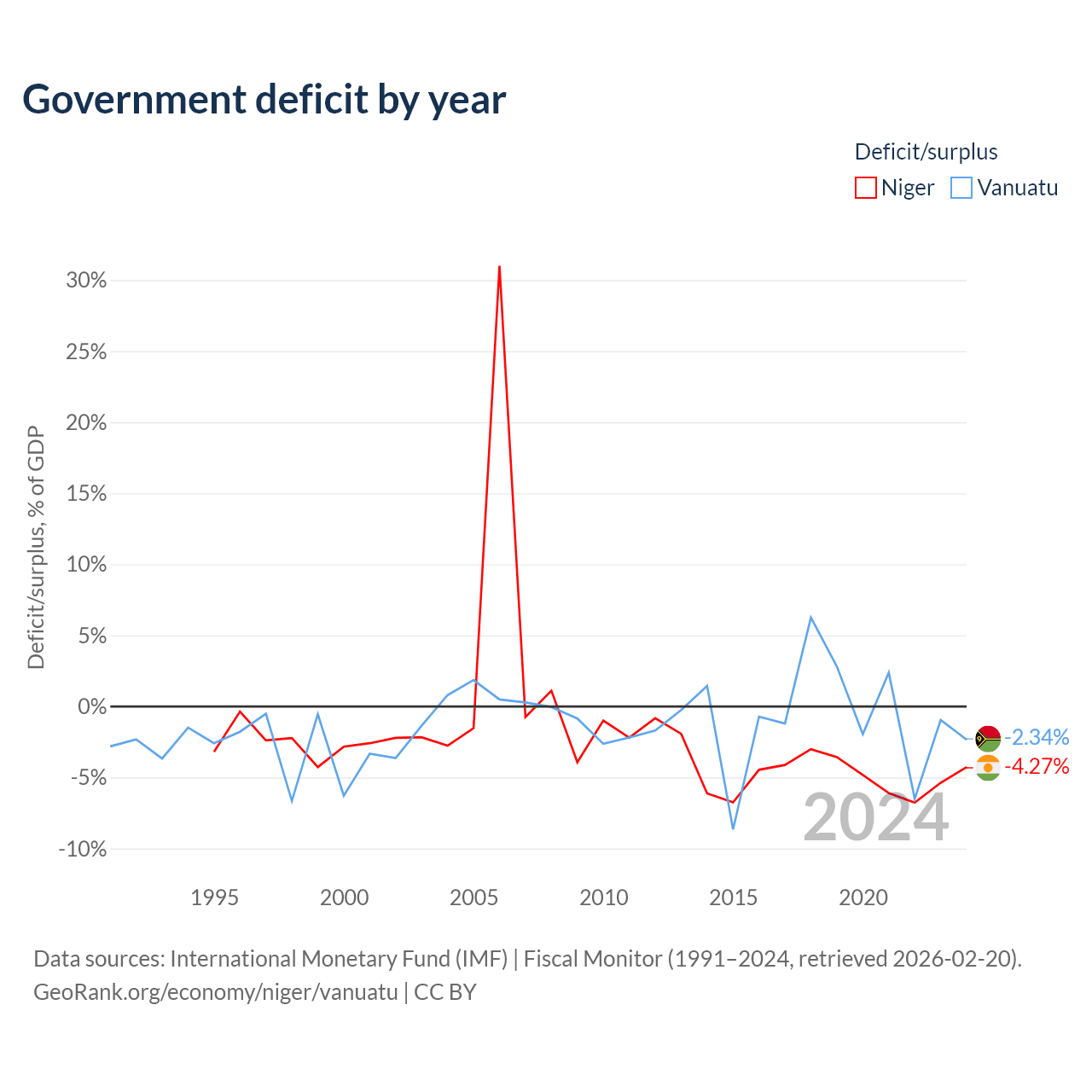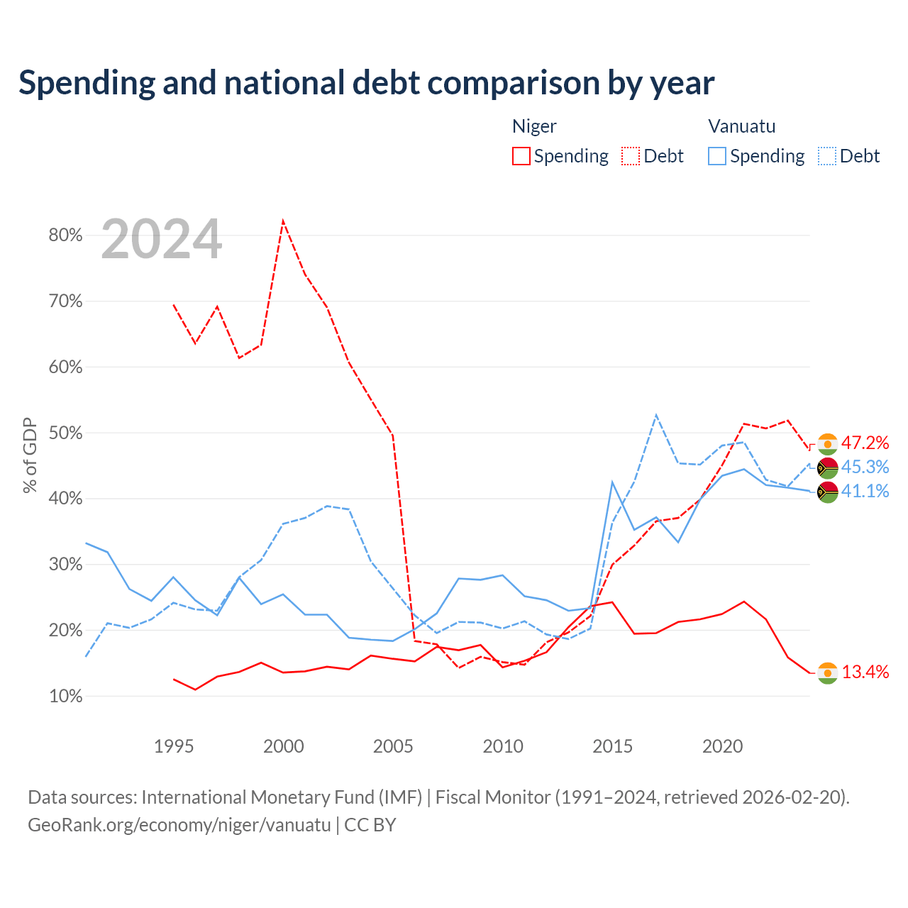 Niger has $9.39B in government debt (47.2% of GDP), compared to $507M (45.3% of GDP) in Vanuatu.