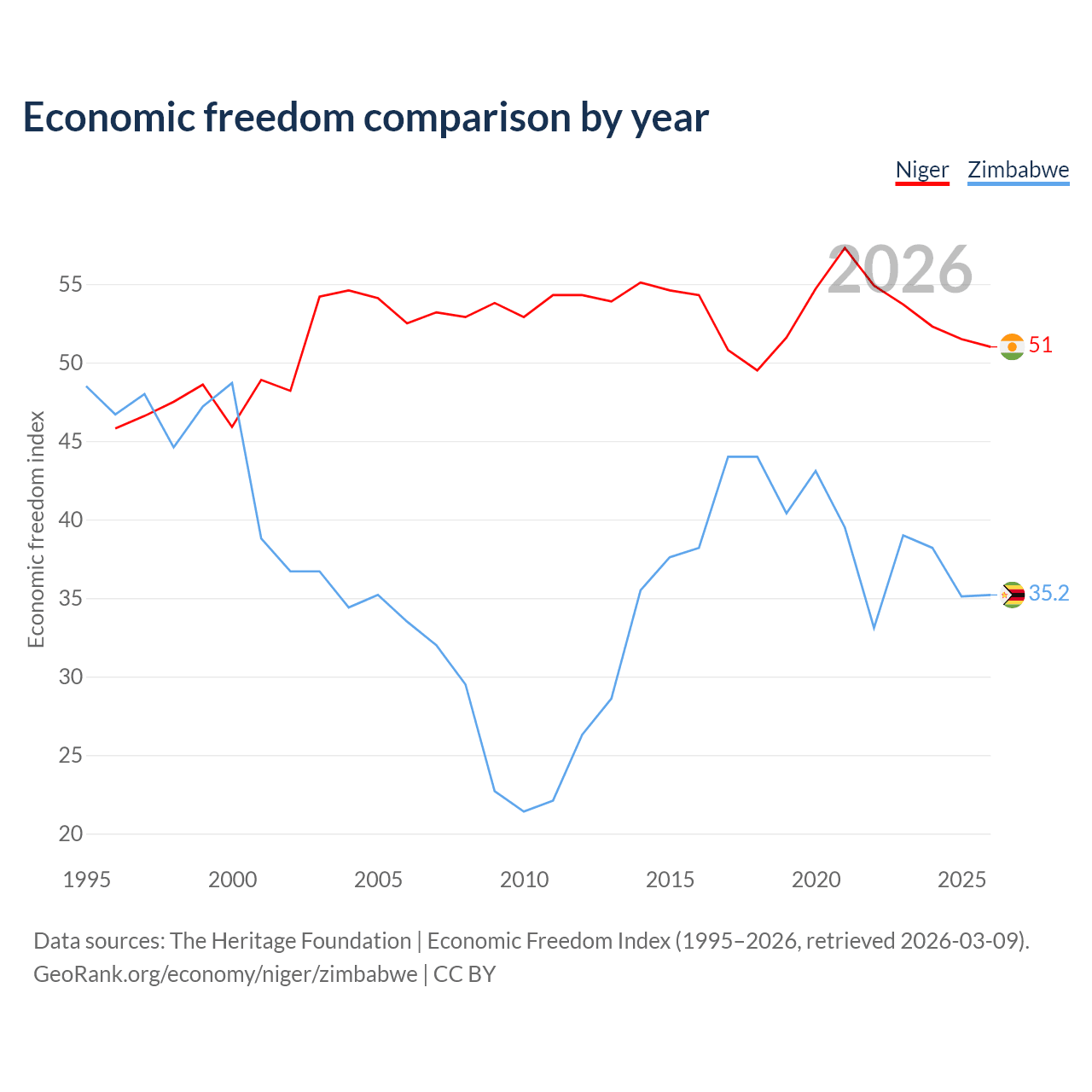 The Economic Freedom Index for Niger is 51, ranking 156/197, compared to 35.2 for Zimbabwe, ranking 190/197. The chart above displays a comparison of annual changes in economic freedom indexes.