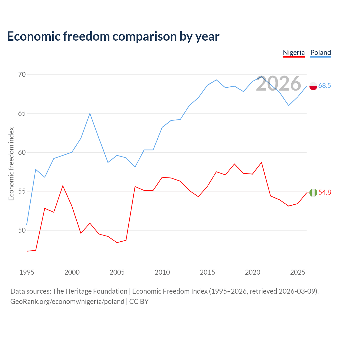 The Economic Freedom Index for Nigeria is 54.8, ranking 132/197, compared to 68.5 for Poland, ranking 46/197. The chart above displays a comparison of annual changes in economic freedom indexes.