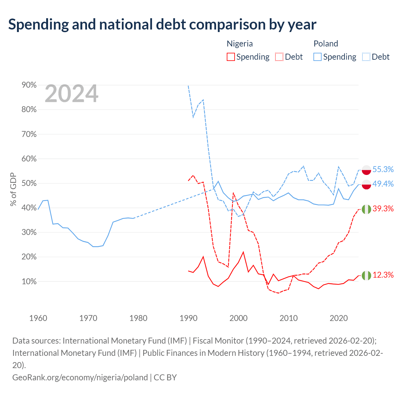Nigeria has $99.2B in government debt (39.3% of GDP), compared to $507B (55.3% of GDP) in Poland.
