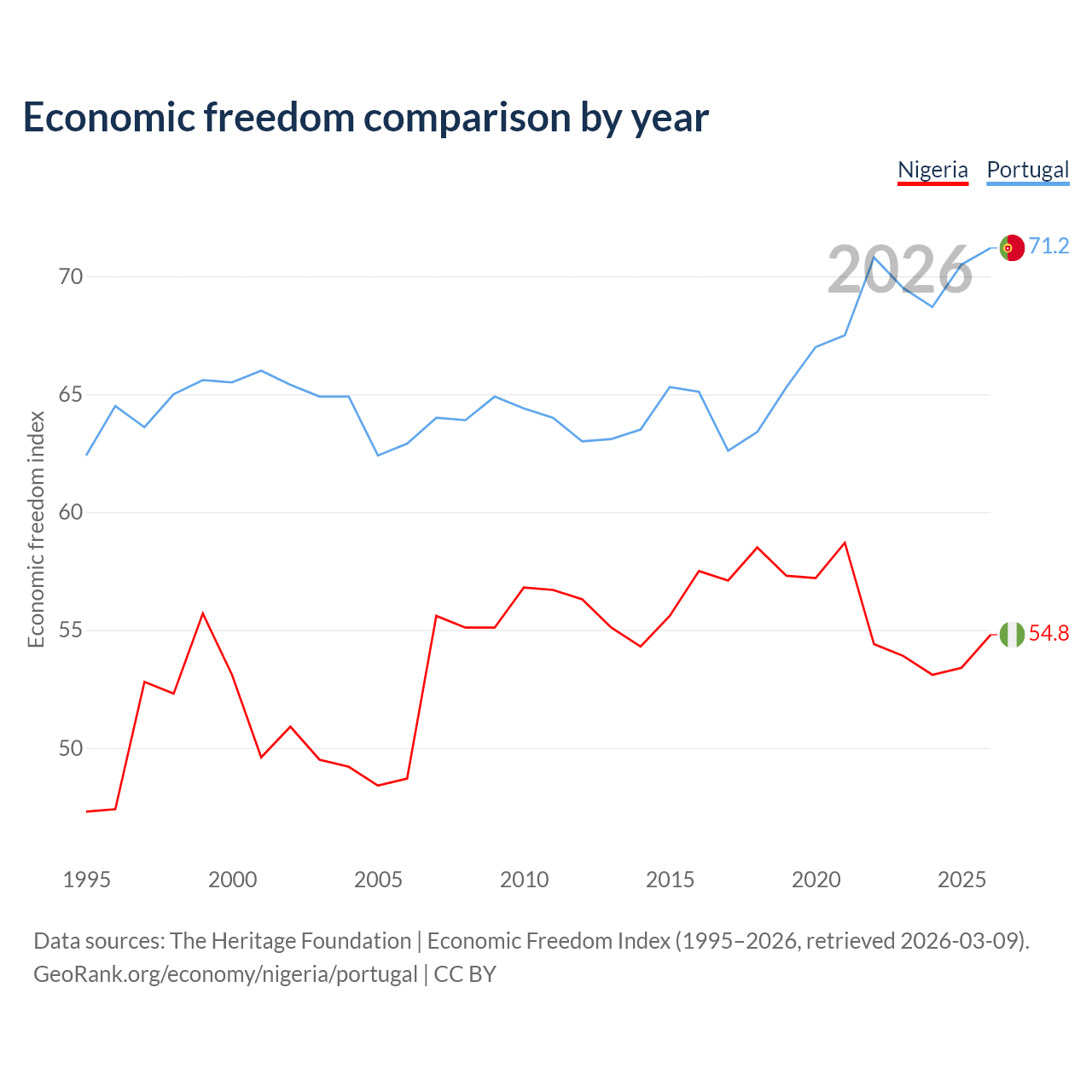 The Economic Freedom Index for Nigeria is 54.8, ranking 132/197, compared to 71.2 for Portugal, ranking 33/197. The chart above displays a comparison of annual changes in economic freedom indexes.