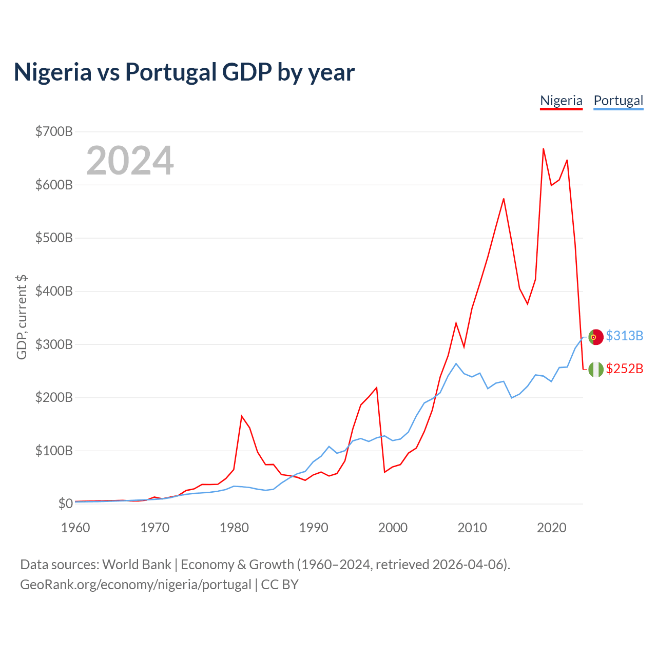 Nigeria has a GDP of $252B compared to $313B for Portugal, ranking 54/197 and 46/197 by economy size, respectively.