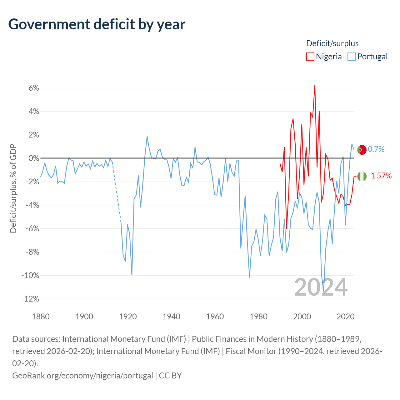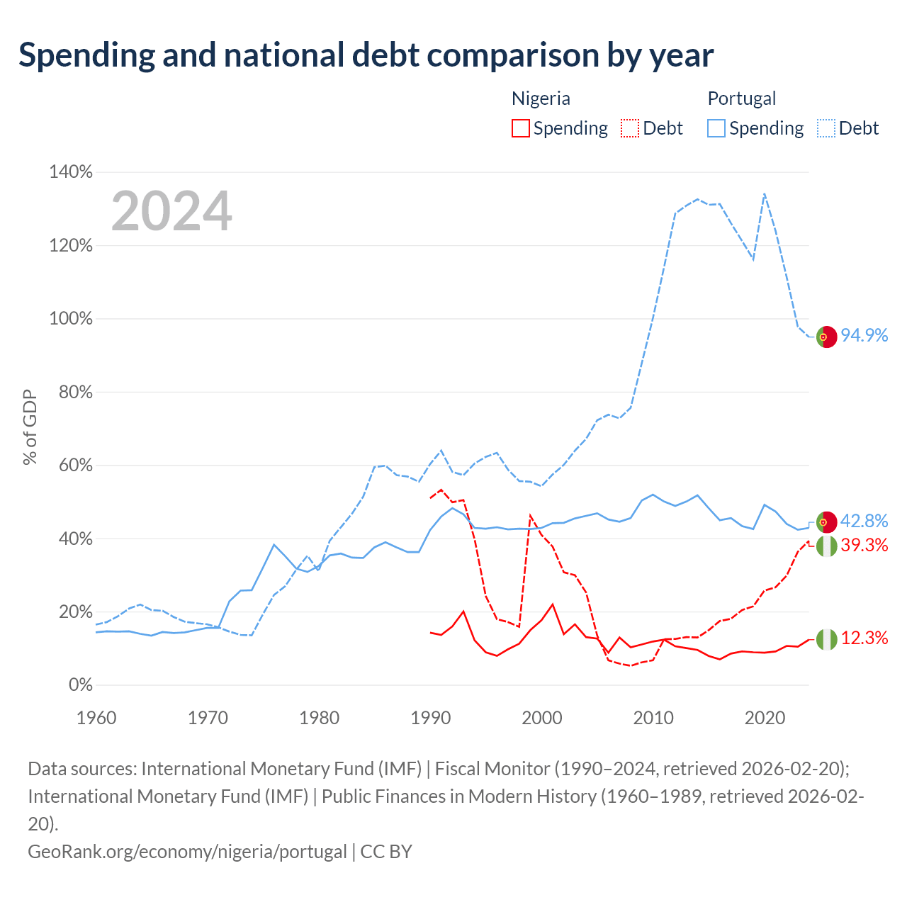 Nigeria has $99.2B in government debt (39.3% of GDP), compared to $297B (94.9% of GDP) in Portugal.