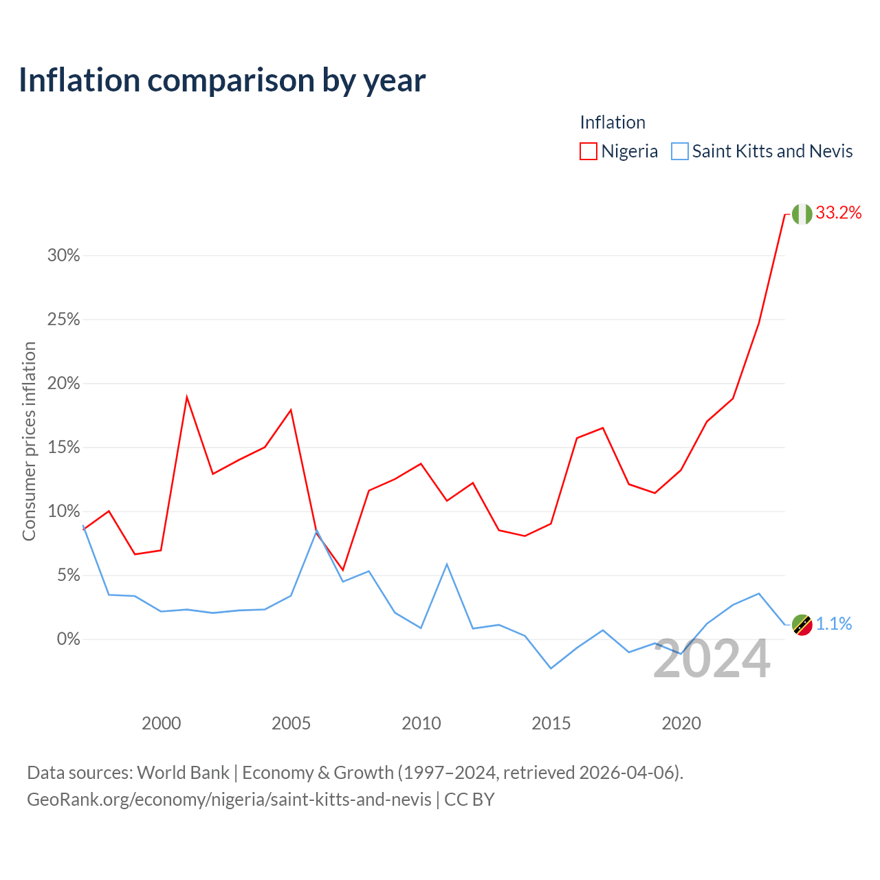 Over the past 28 years, Nigeria has recorded an average annual inflation rate of 13.3%, compared with 2.25% in Saint Kitts and Nevis. In 2024, inflation was 33.2% in Nigeria and 1.1% in Saint Kitts and Nevis.