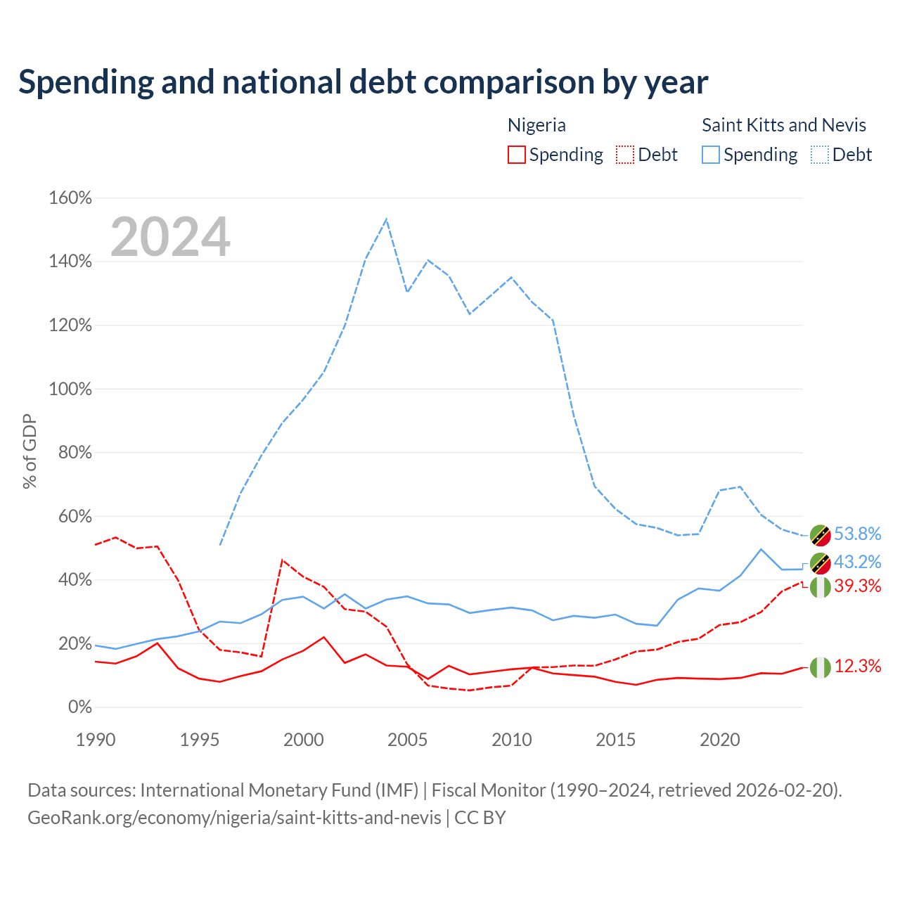 Nigeria has $99.2B in government debt (39.3% of GDP), compared to $604M (53.8% of GDP) in Saint Kitts and Nevis.