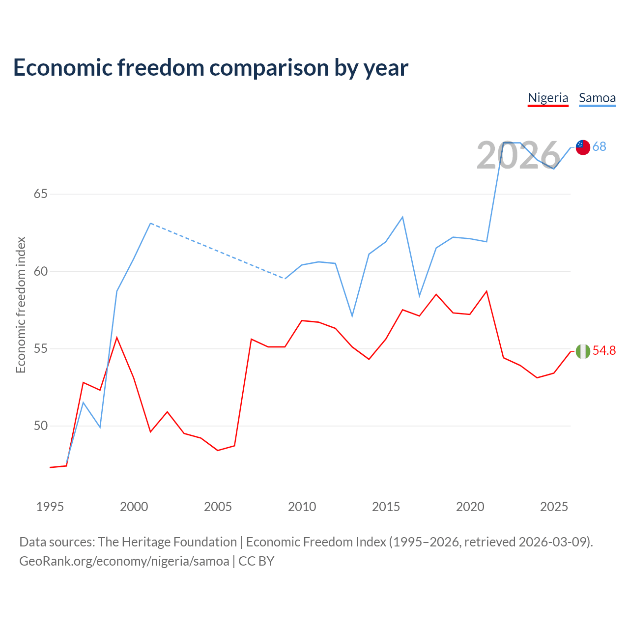 The Economic Freedom Index for Nigeria is 54.8, ranking 132/197, compared to 68 for Samoa, ranking 52/197. The chart above displays a comparison of annual changes in economic freedom indexes.