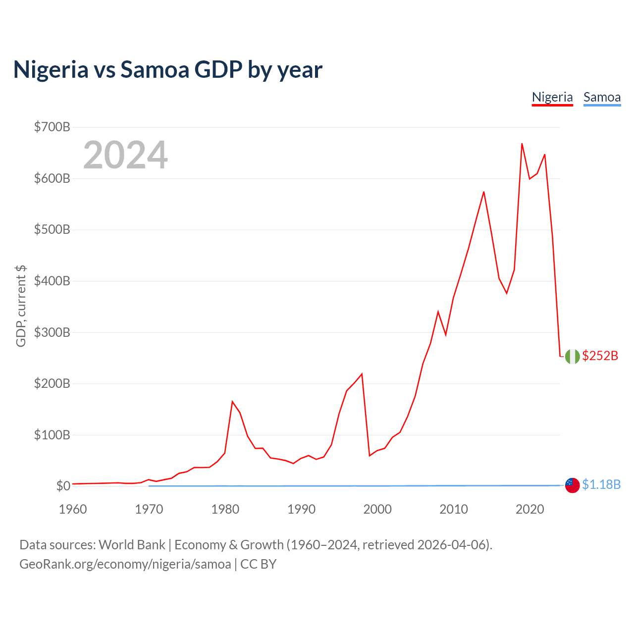 Nigeria has a GDP of $252B compared to $1.18B for Samoa, ranking 54/197 and 185/197 by economy size, respectively.