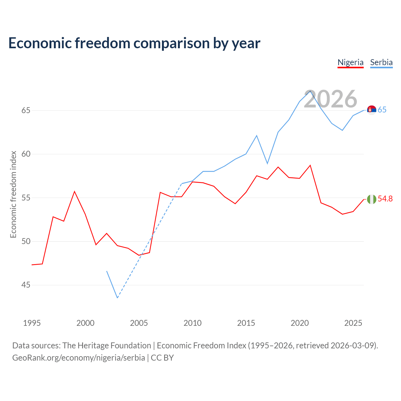 The Economic Freedom Index for Nigeria is 54.8, ranking 132/197, compared to 65 for Serbia, ranking 68/197. The chart above displays a comparison of annual changes in economic freedom indexes.