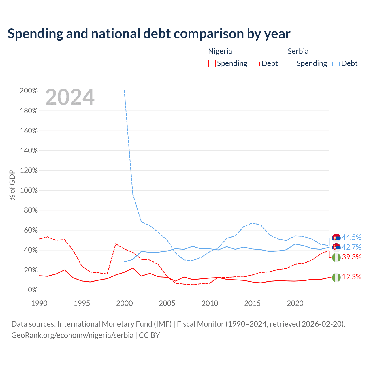 Nigeria has $99.2B in government debt (39.3% of GDP), compared to $40.1B (44.5% of GDP) in Serbia.
