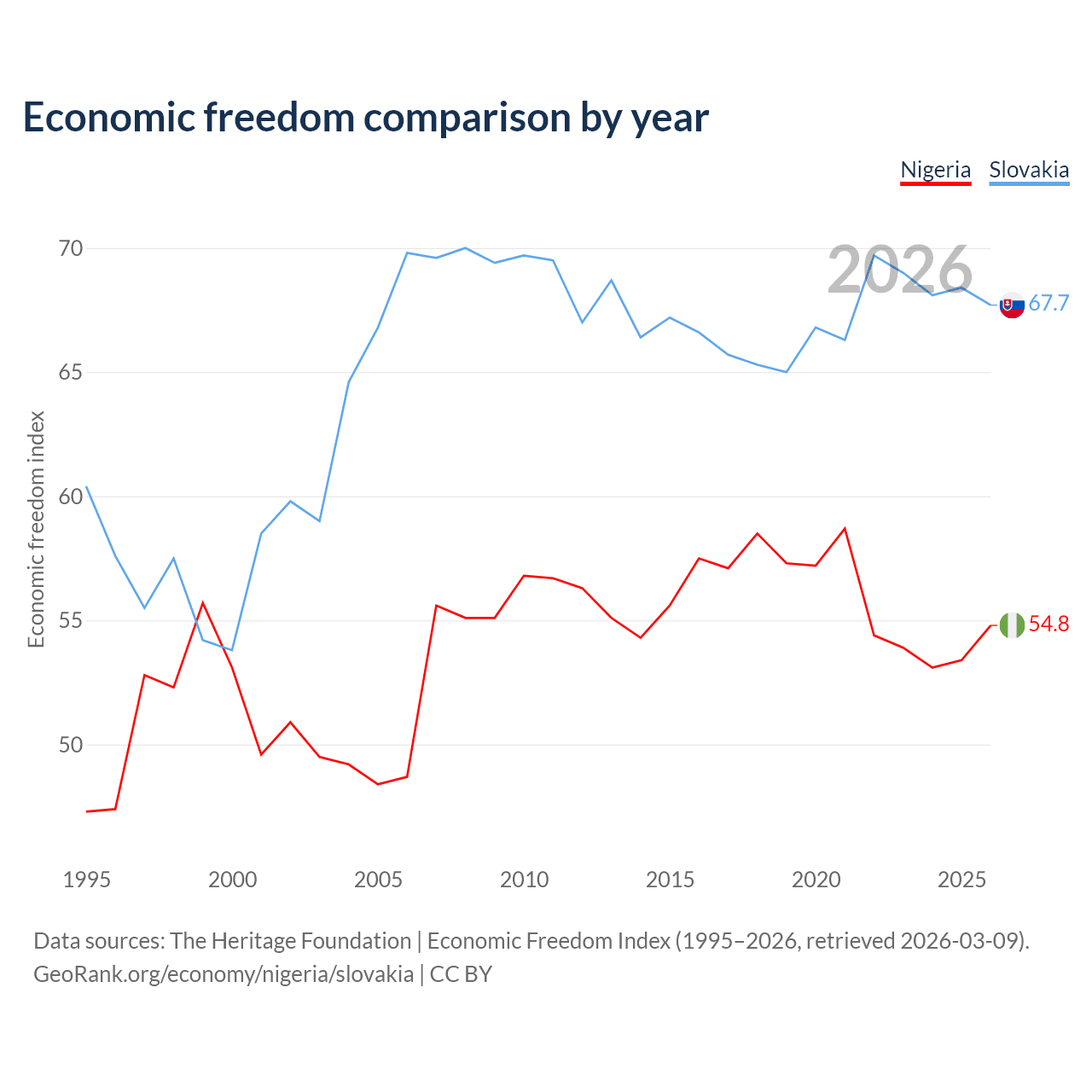 The Economic Freedom Index for Nigeria is 54.8, ranking 132/197, compared to 67.7 for Slovakia, ranking 54/197. The chart above displays a comparison of annual changes in economic freedom indexes.