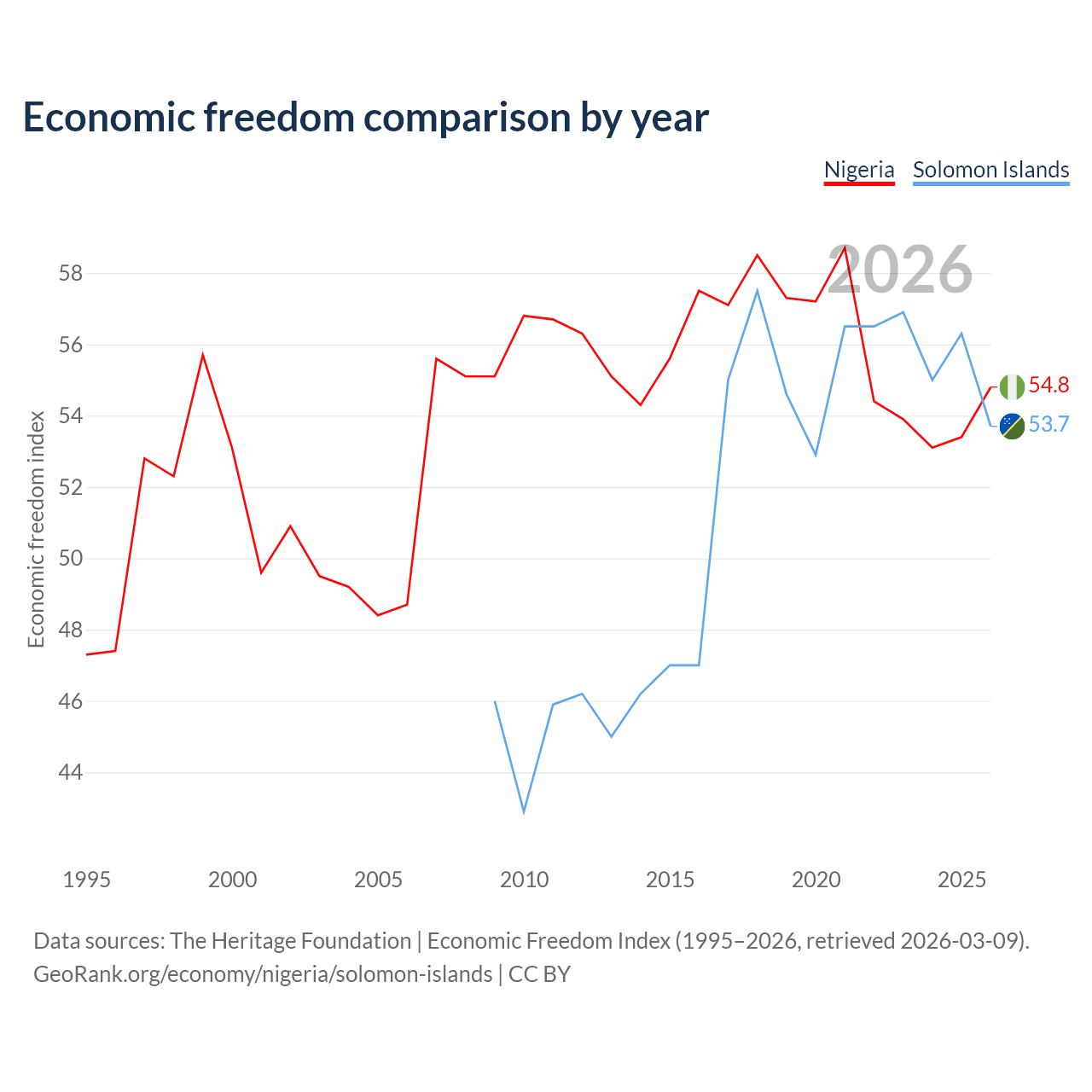 The Economic Freedom Index for Nigeria is 54.8, ranking 132/197, compared to 53.7 for the Solomon Islands, ranking 137/197. The chart above displays a comparison of annual changes in economic freedom indexes.