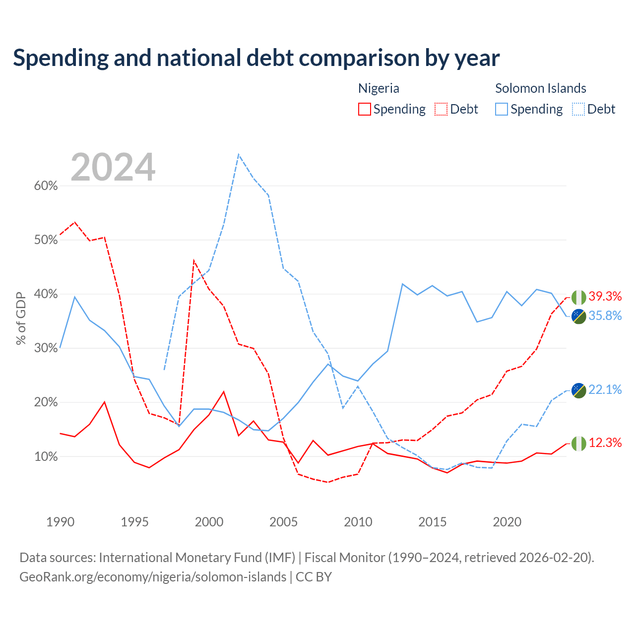 Nigeria has $99.2B in government debt (39.3% of GDP), compared to $350M (22.1% of GDP) in the Solomon Islands.