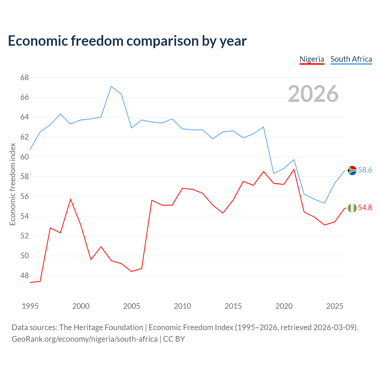 Data sources: The Heritage Foundation | Economic Freedom Index (1995–2026, retrieved 2026-03-09).