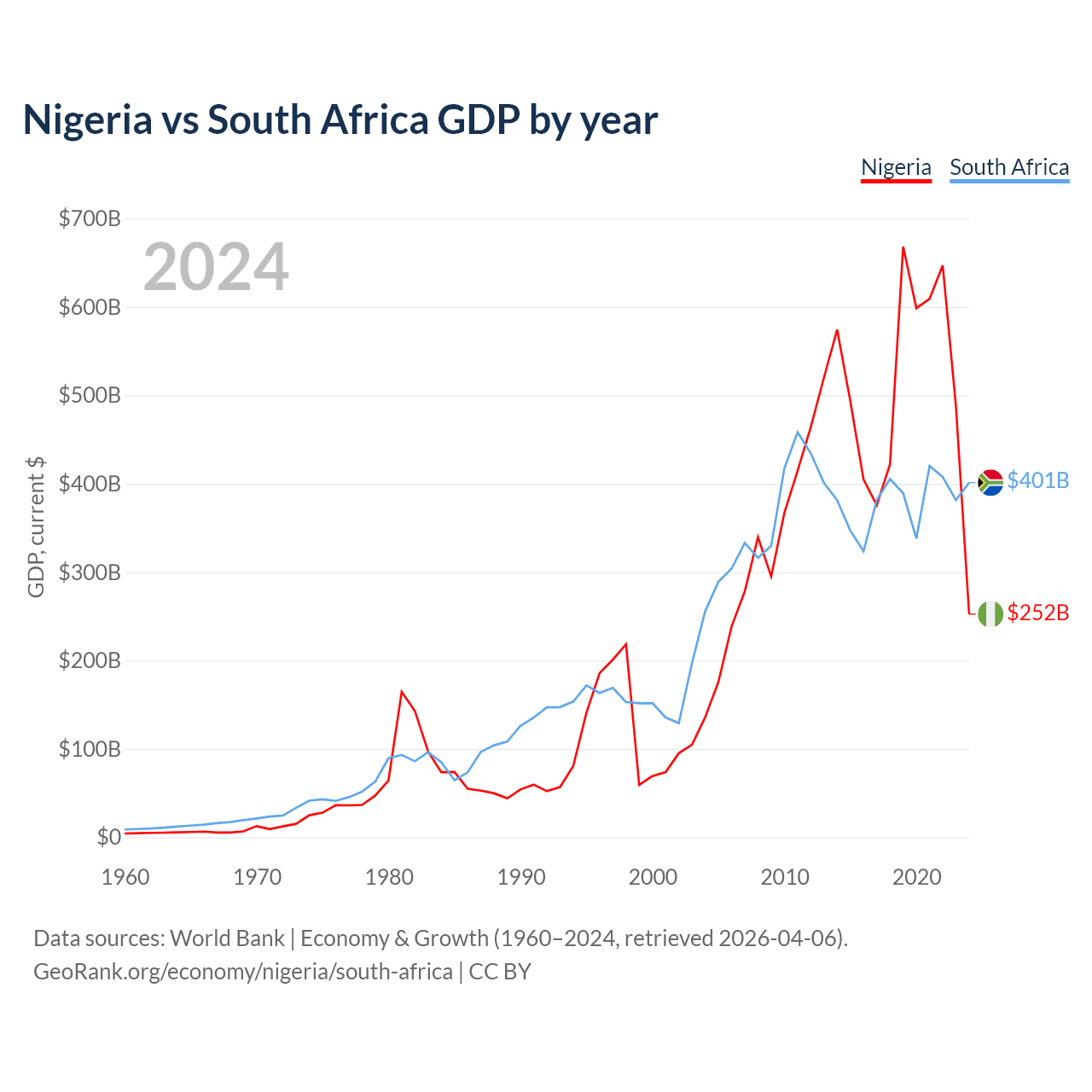 Nigeria vs South Africa GDP by year