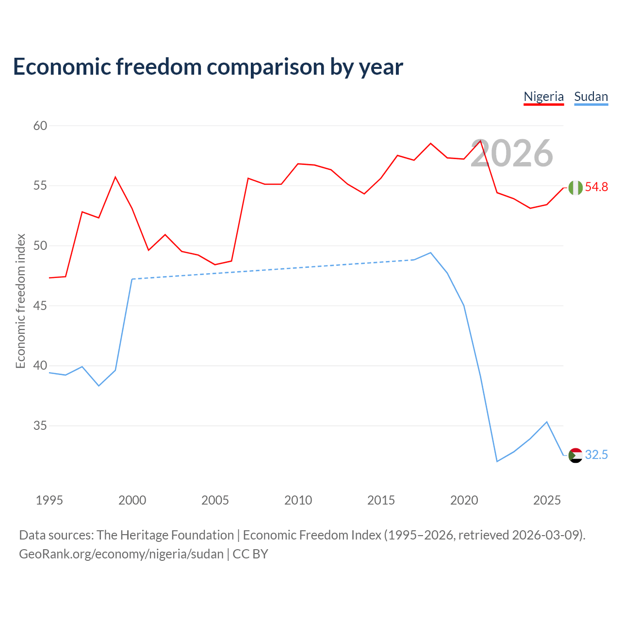 The Economic Freedom Index for Nigeria is 54.8, ranking 132/197, compared to 32.5 for Sudan, ranking 191/197. The chart above displays a comparison of annual changes in economic freedom indexes.