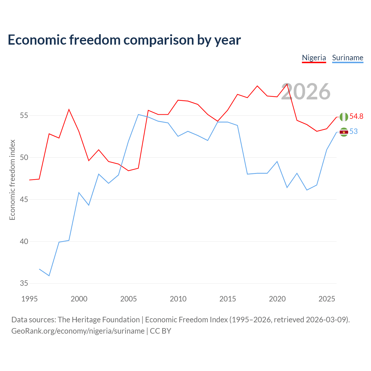 The Economic Freedom Index for Nigeria is 54.8, ranking 132/197, compared to 53 for Suriname, ranking 143/197. The chart above displays a comparison of annual changes in economic freedom indexes.
