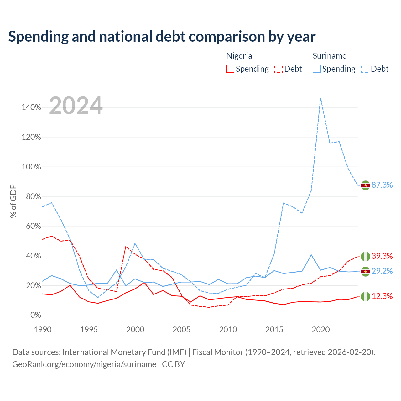 Nigeria has $99.2B in government debt (39.3% of GDP), compared to $3.86B (87.3% of GDP) in Suriname.
