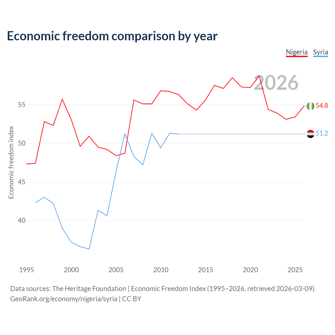 The Economic Freedom Index for Nigeria is 54.8, ranking 132/197, compared to 51.2 for Syria, ranking 155/197. The chart above displays a comparison of annual changes in economic freedom indexes.