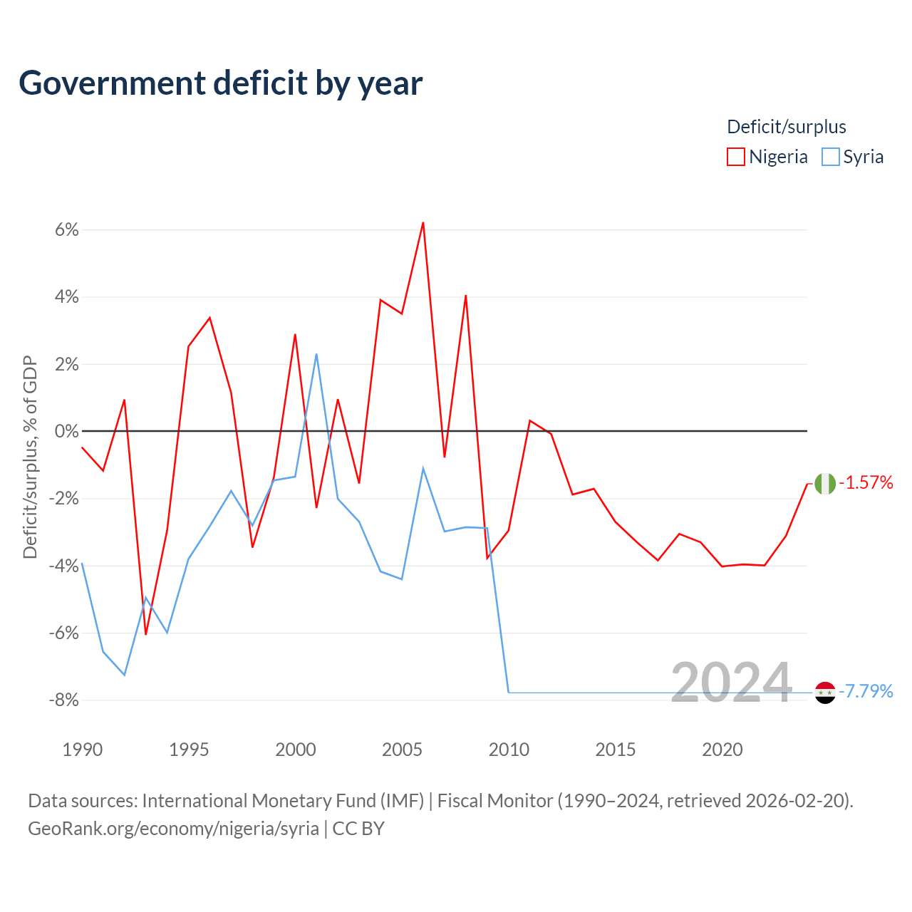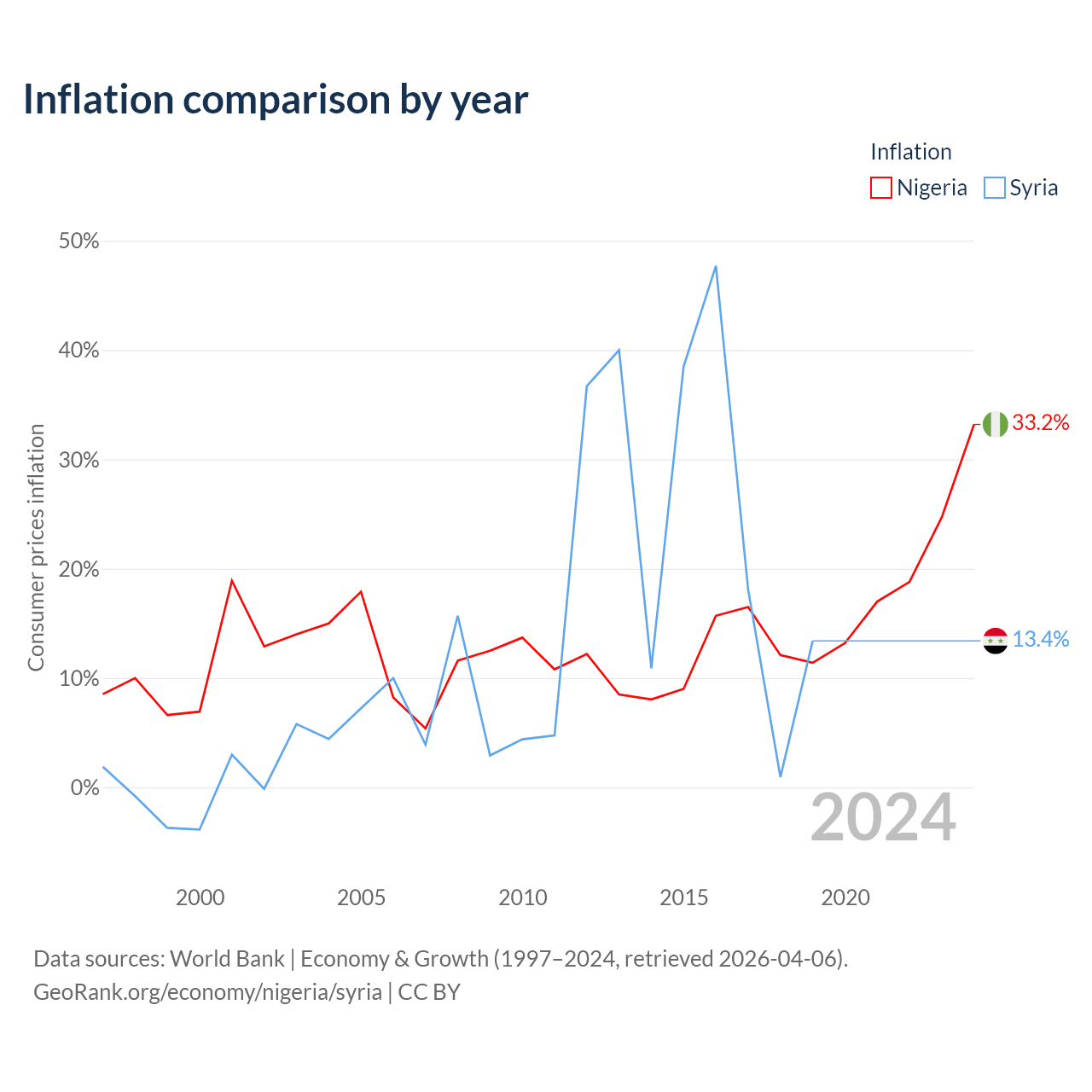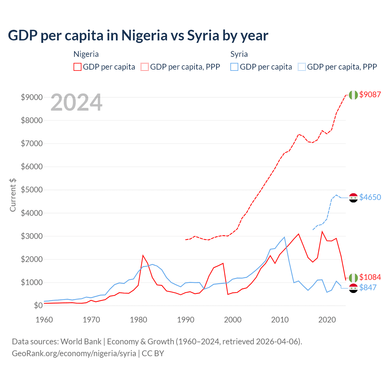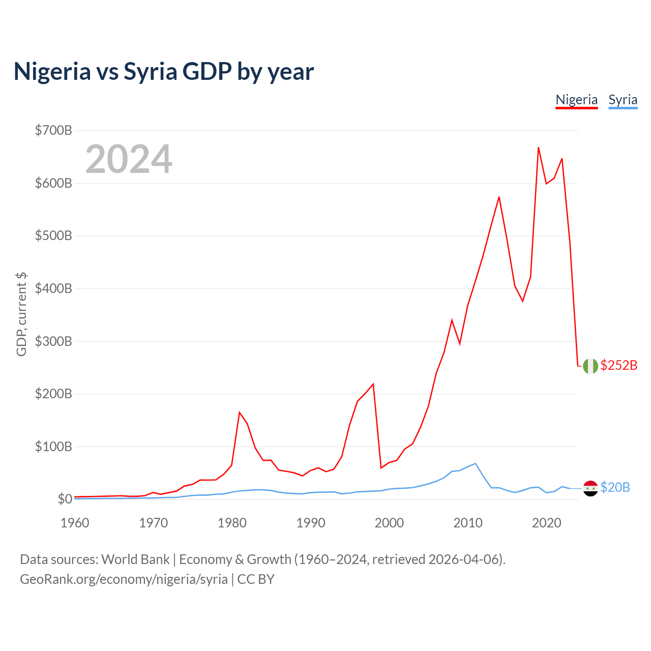 Nigeria has a GDP of $252B compared to $20B for Syria, ranking 54/197 and 129/197 by economy size, respectively.
