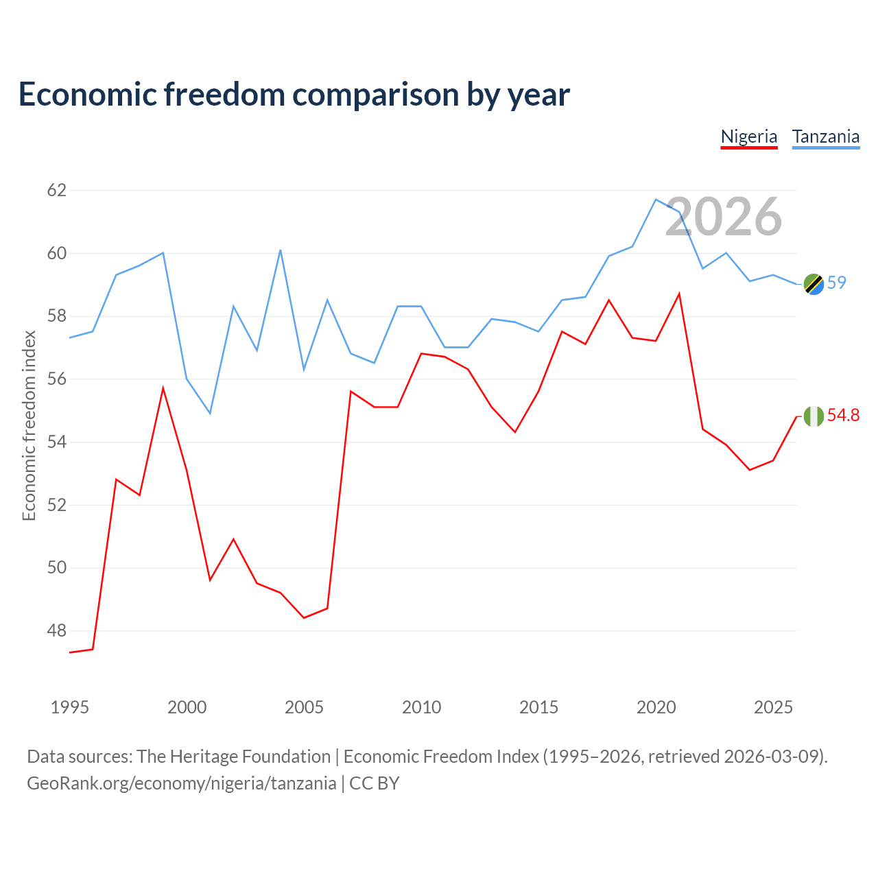 The Economic Freedom Index for Nigeria is 54.8, ranking 132/197, compared to 59 for Tanzania, ranking 106/197. The chart above displays a comparison of annual changes in economic freedom indexes.