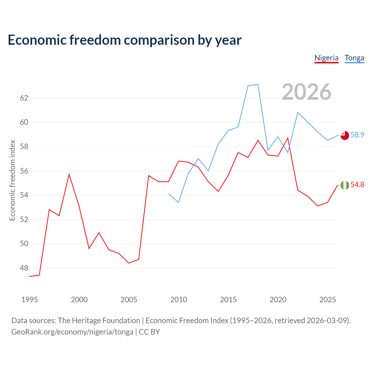 The Economic Freedom Index for Nigeria is 54.8, ranking 132/197, compared to 58.9 for Tonga, ranking 107/197. The chart above displays a comparison of annual changes in economic freedom indexes.