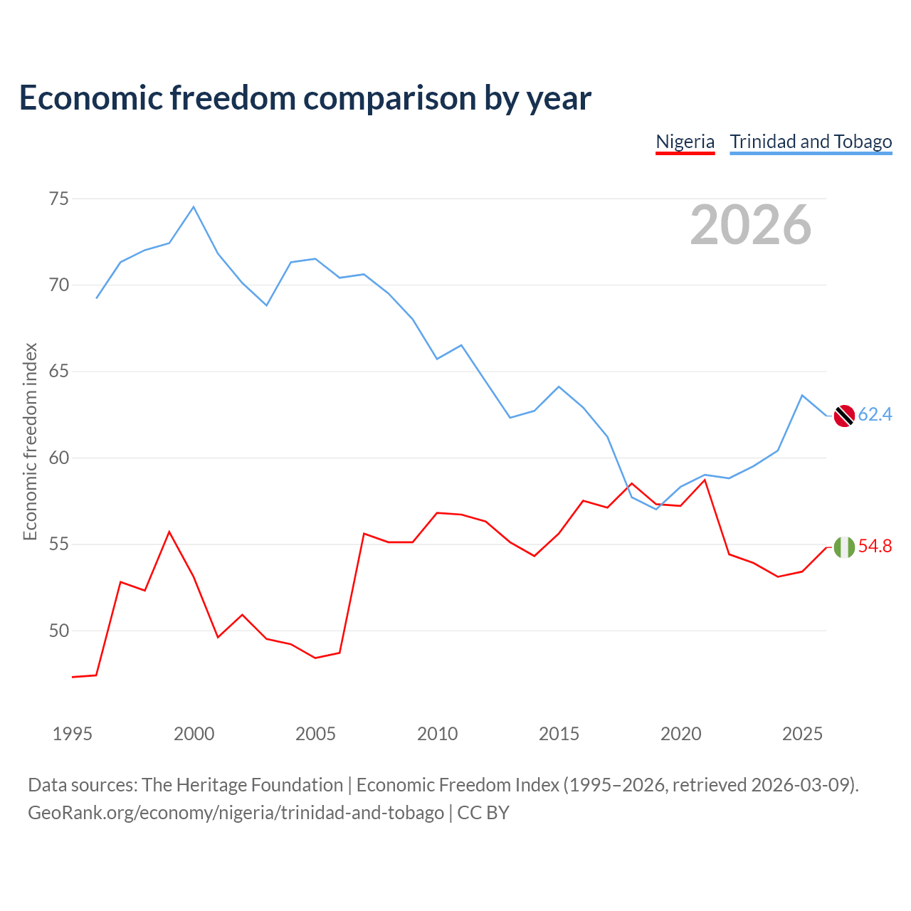 The Economic Freedom Index for Nigeria is 54.8, ranking 132/197, compared to 62.4 for Trinidad and Tobago, ranking 87/197. The chart above displays a comparison of annual changes in economic freedom indexes.