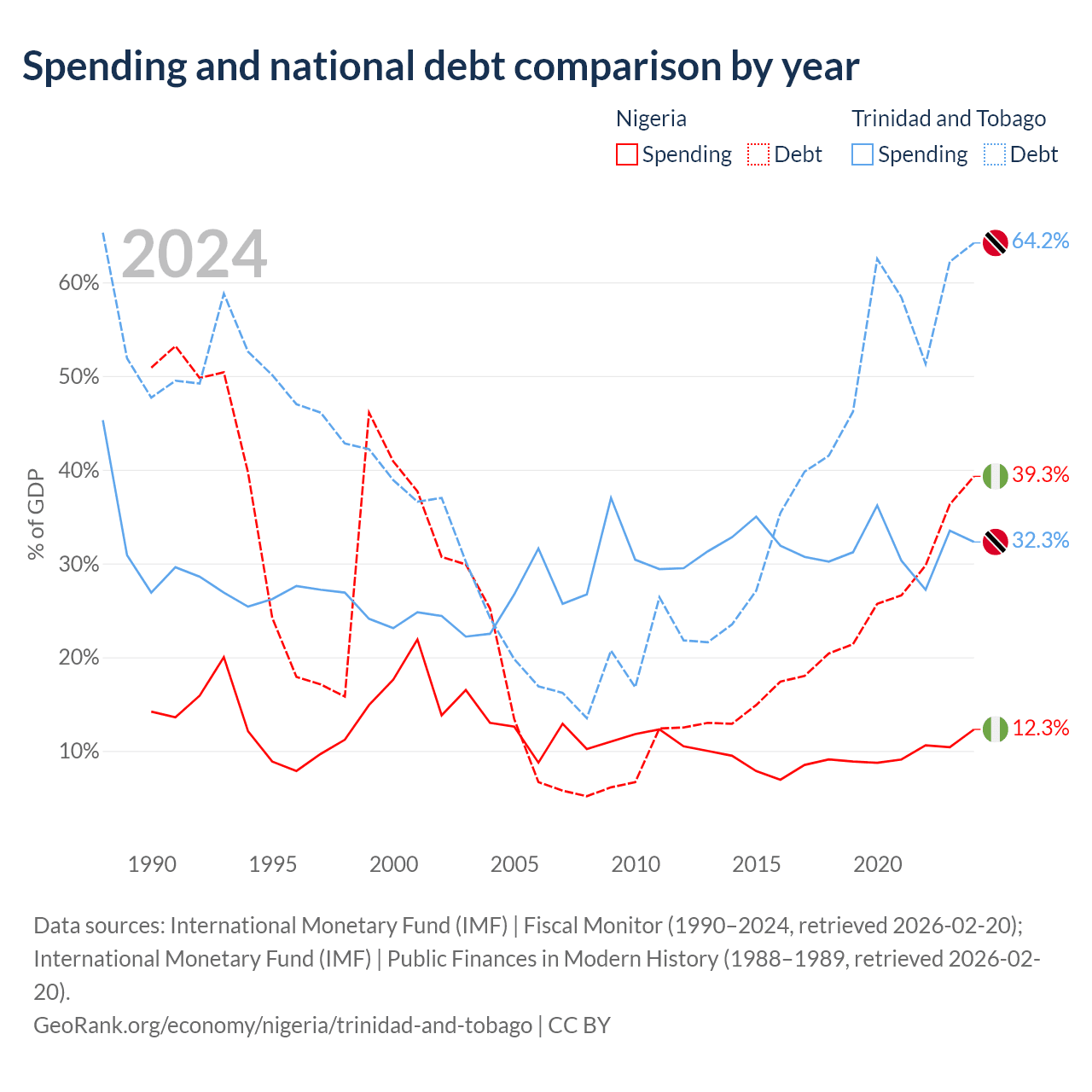 Nigeria has $99.2B in government debt (39.3% of GDP), compared to $16.5B (64.2% of GDP) in Trinidad and Tobago.