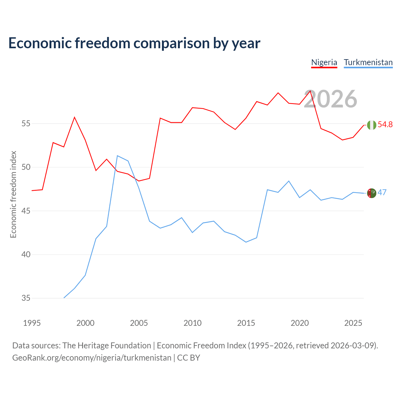 The Economic Freedom Index for Nigeria is 54.8, ranking 132/197, compared to 47 for Turkmenistan, ranking 177/197. The chart above displays a comparison of annual changes in economic freedom indexes.