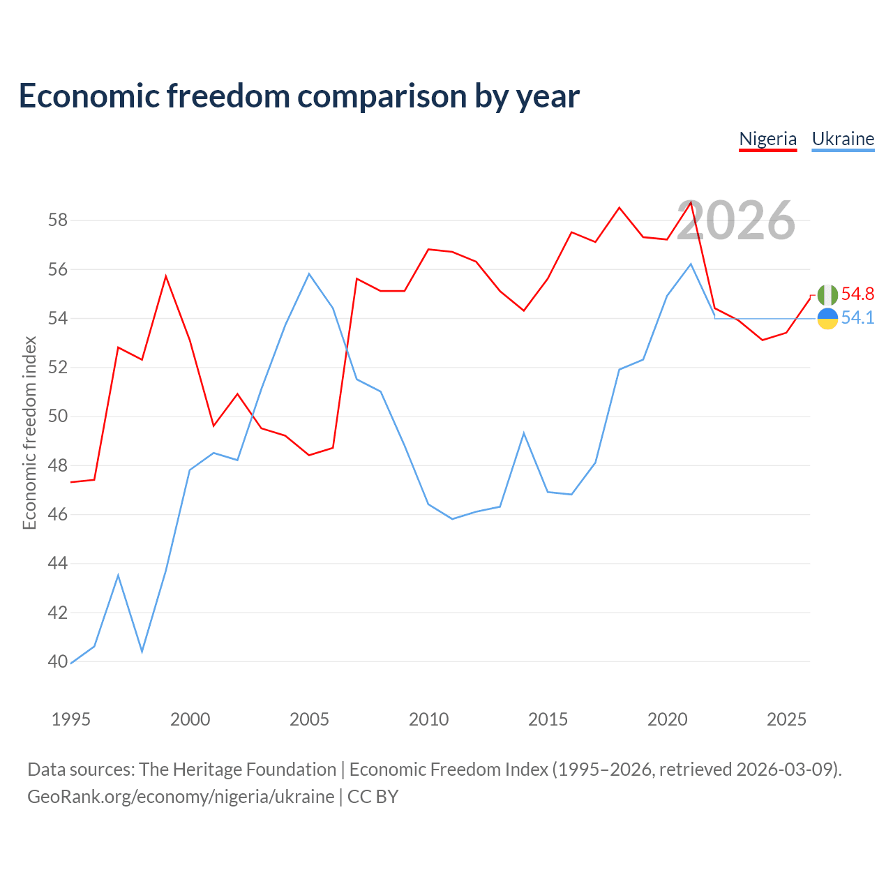 The Economic Freedom Index for Nigeria is 54.8, ranking 132/197, compared to 54.1 for Ukraine, ranking 135/197. The chart above displays a comparison of annual changes in economic freedom indexes.