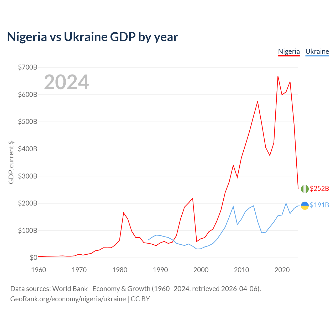 Nigeria has a GDP of $252B compared to $191B for Ukraine, ranking 54/197 and 57/197 by economy size, respectively.