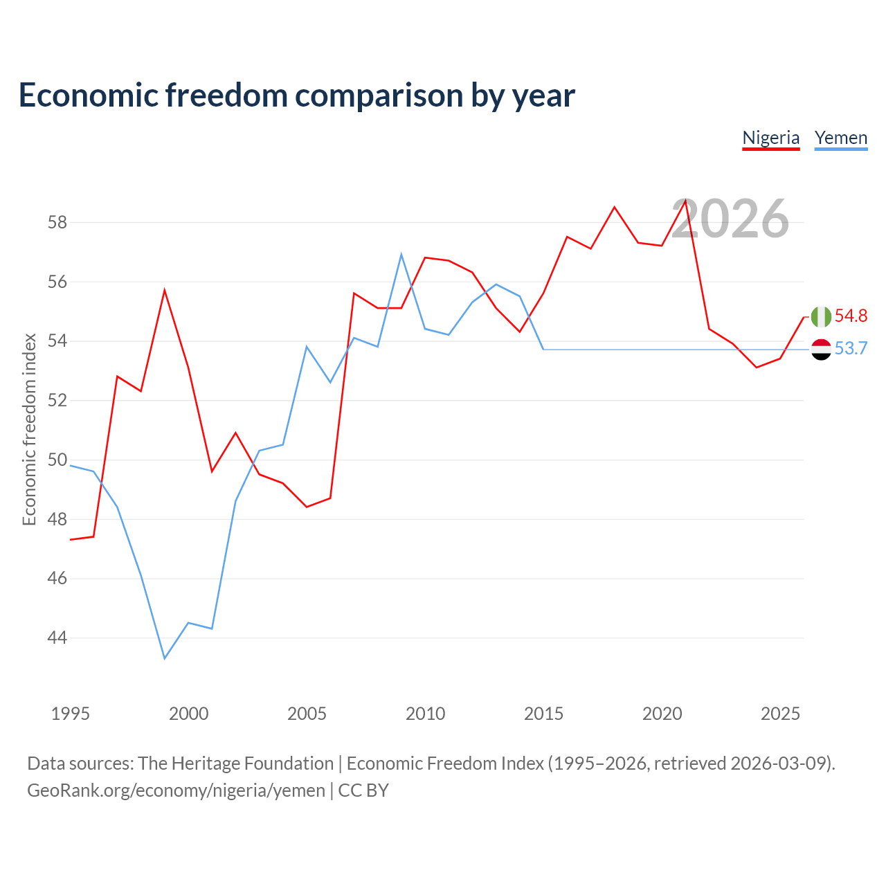 The Economic Freedom Index for Nigeria is 54.8, ranking 132/197, compared to 53.7 for Yemen, ranking 138/197. The chart above displays a comparison of annual changes in economic freedom indexes.