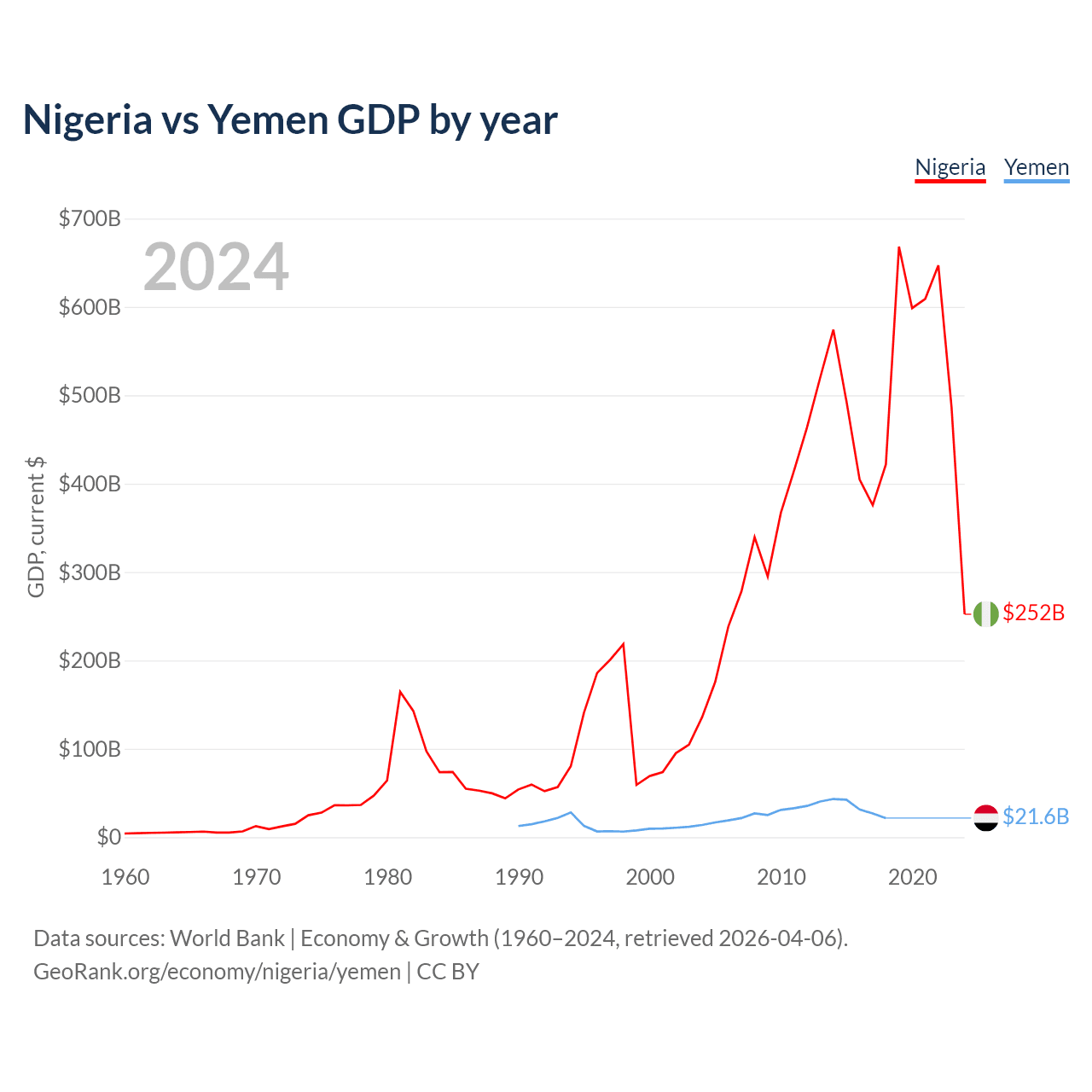Nigeria has a GDP of $252B compared to $21.6B for Yemen, ranking 54/197 and 125/197 by economy size, respectively.