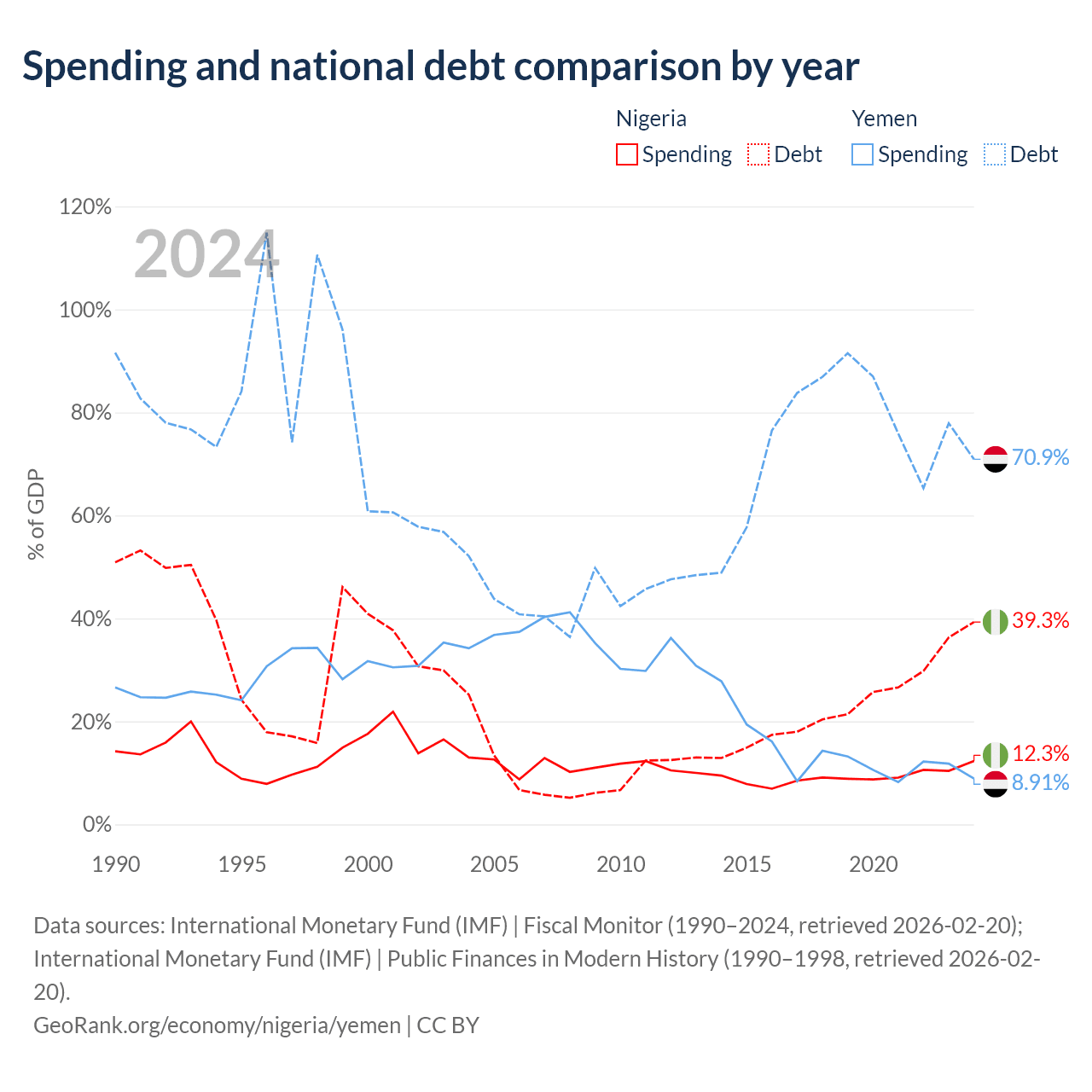 Nigeria has $99.2B in government debt (39.3% of GDP), compared to $18.8B (70.9% of GDP) in Yemen.