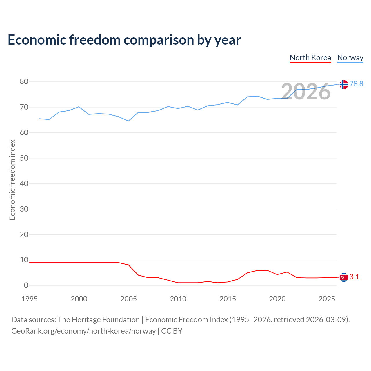 The Economic Freedom Index for North Korea is 3.1, ranking 197/197, compared to 78.8 for Norway, ranking 9/197. The chart above displays a comparison of annual changes in economic freedom indexes.
