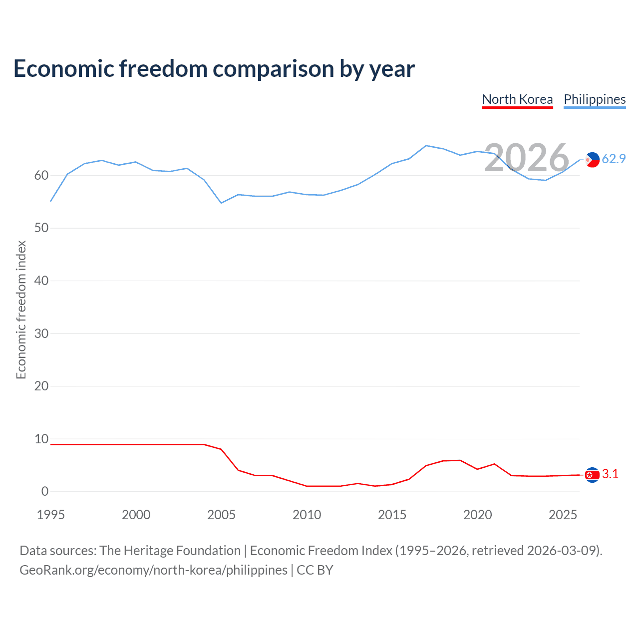 The Economic Freedom Index for North Korea is 3.1, ranking 197/197, compared to 62.9 for the Philippines, ranking 85/197. The chart above displays a comparison of annual changes in economic freedom indexes.