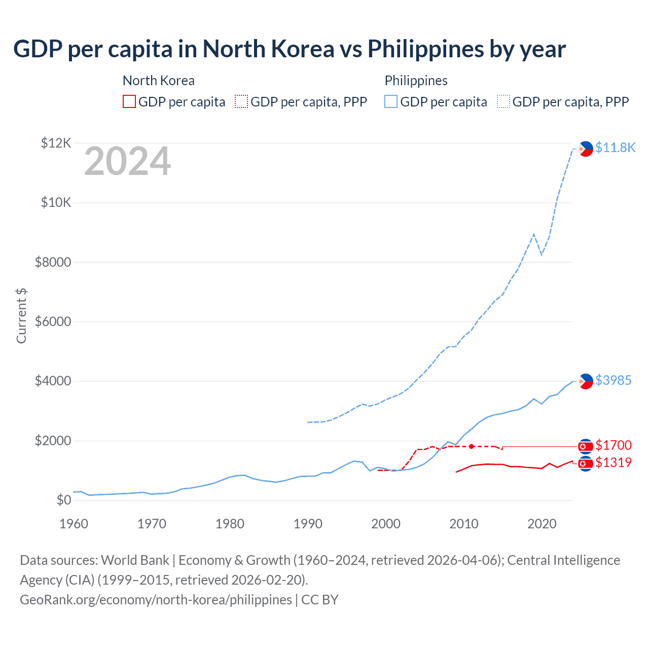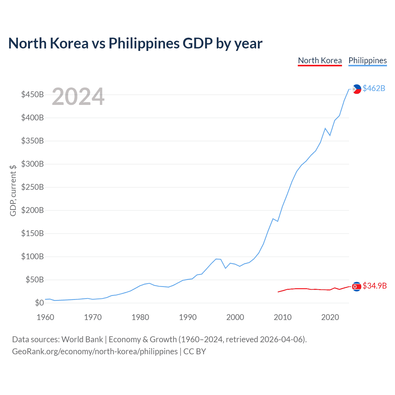 North Korea has a GDP of $34.9B compared to $462B for the Philippines, ranking 106/197 and 35/197 by economy size, respectively.
